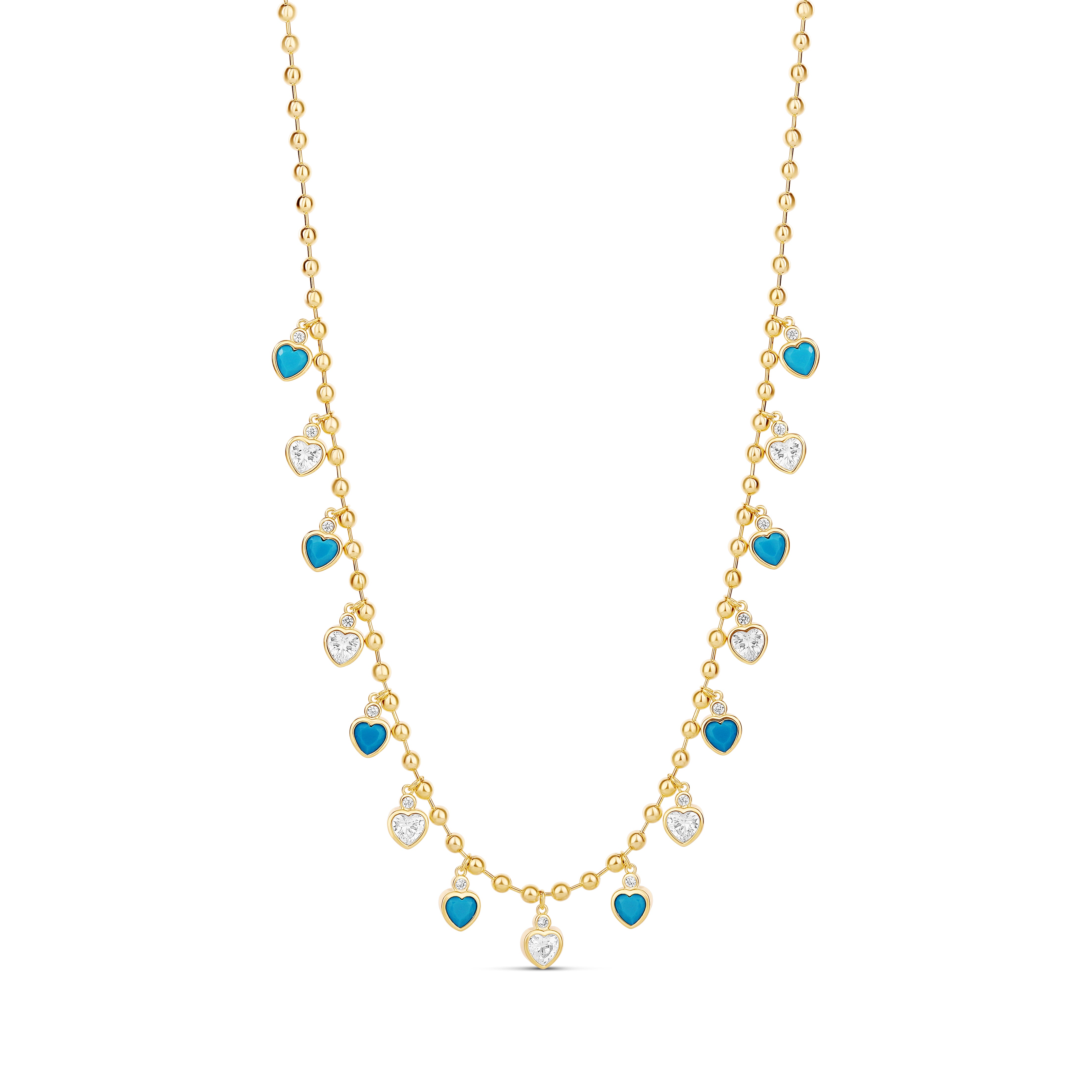 Playful yet polished, the Color Love Necklace features a delicate gold beaded chain adorned with alternating turquoise enamel hearts and shimmering clear heart charms. Each charm dances effortlessly along the neckline, creating a romantic rhythm of color and sparkle. Perfect for layering or wearing solo, this piece adds a fresh pop of blue and a touch of love to any look—easy, joyful, and endlessly wearable.