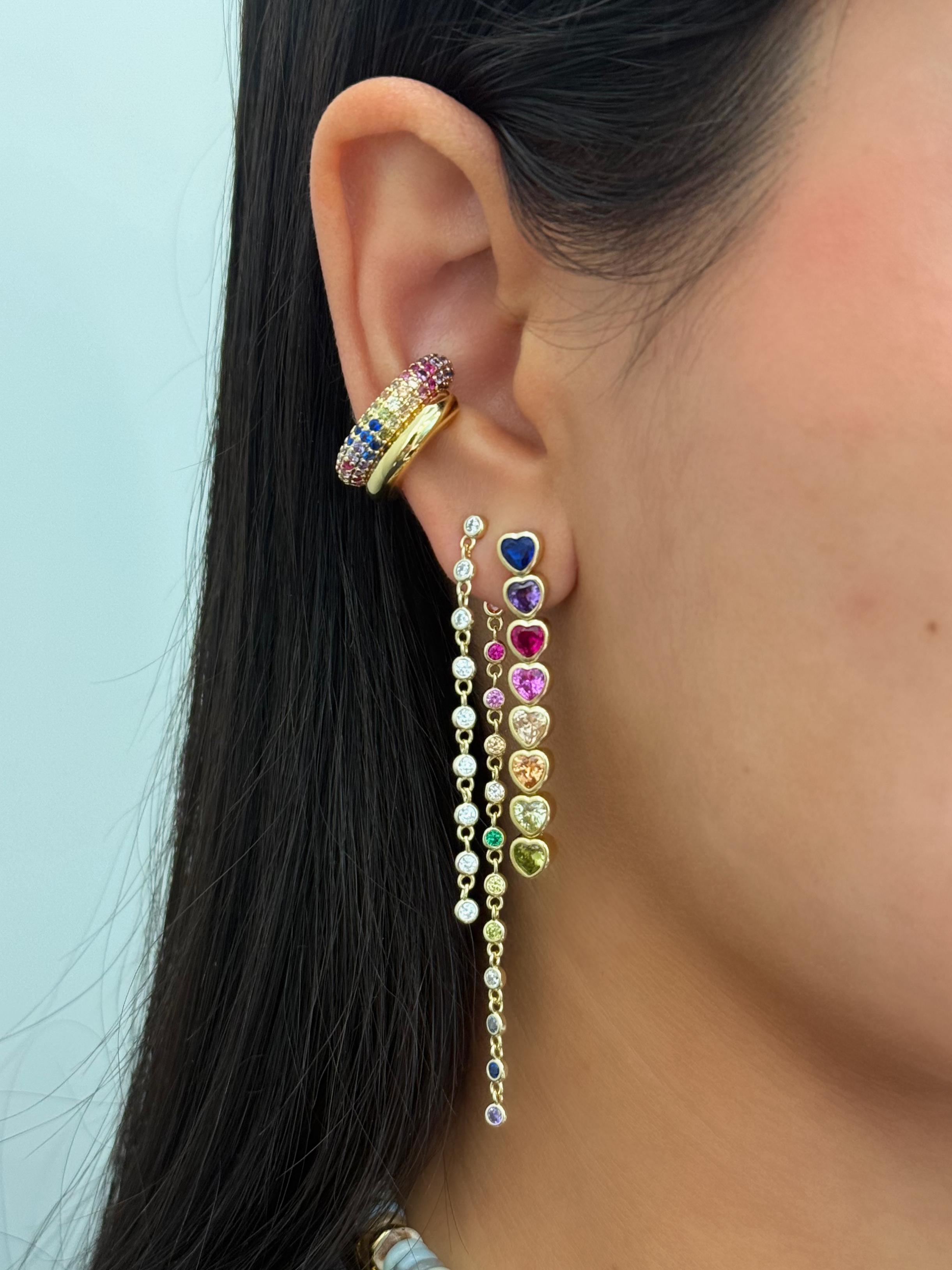 A rainbow of love you can wear. These gold-plated drop earrings feature a vertical row of heart-shaped stones in every shade — from deep sapphire to blush pink — catching the light with every move.