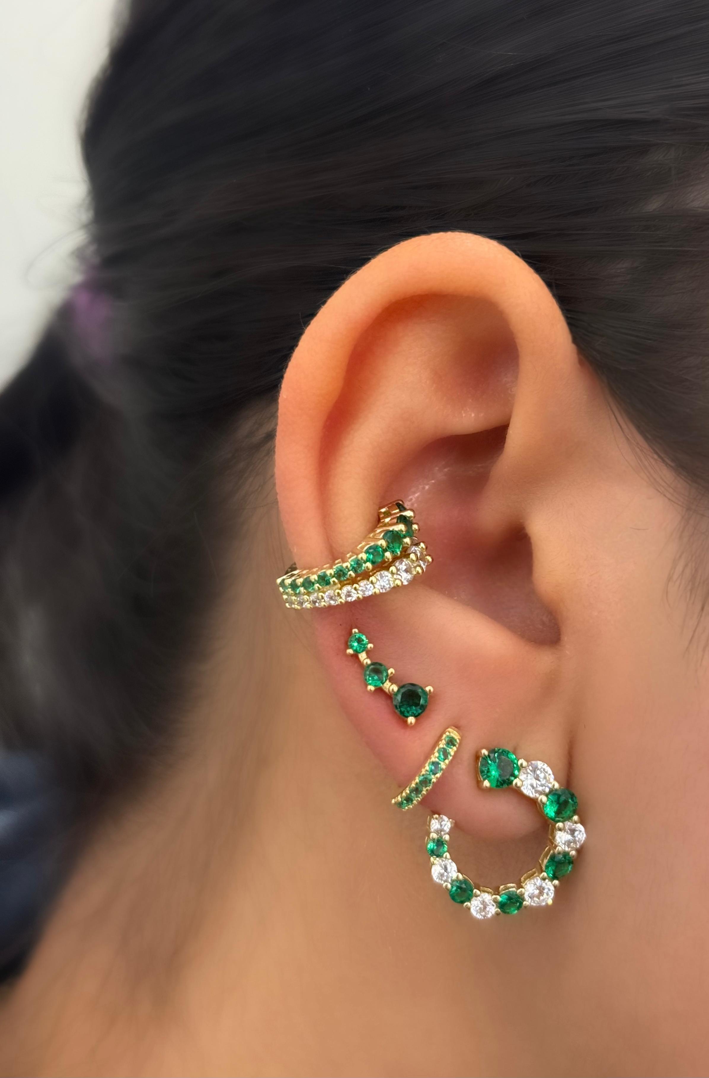 Your new statement-without-trying earrings. These half-hoops feature a stunning alternating pattern of vivid emerald or turquoise stones and brilliant CZs, all set in a refined, lighter 18K gold finish for a fresh, modern glow. The perfect mix of color and sparkle, they catch the light beautifully from every angle. Lightweight, comfortable, and waterproof, they’re the ideal pop of luxe for any ear stack—day or night.