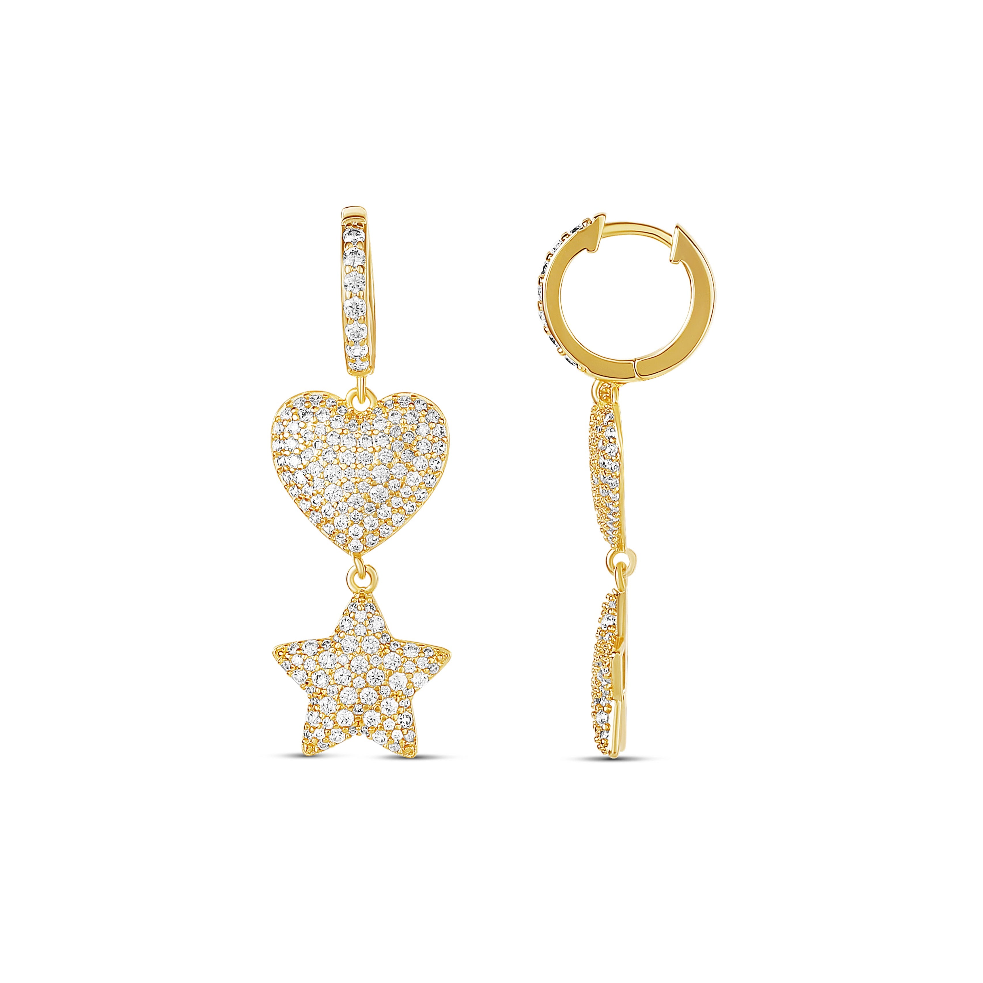 A dreamy mix of romance and sparkle, the Starlit Love Drop Huggies feature pavé-set gold huggie hoops adorned with a shimmering heart charm and a dangling star. Designed to move beautifully with every step, these earrings balance playful charm with polished elegance. Perfect for day-to-night styling, they add a touch of magic, love, and celestial glow to any look. 🌟💖