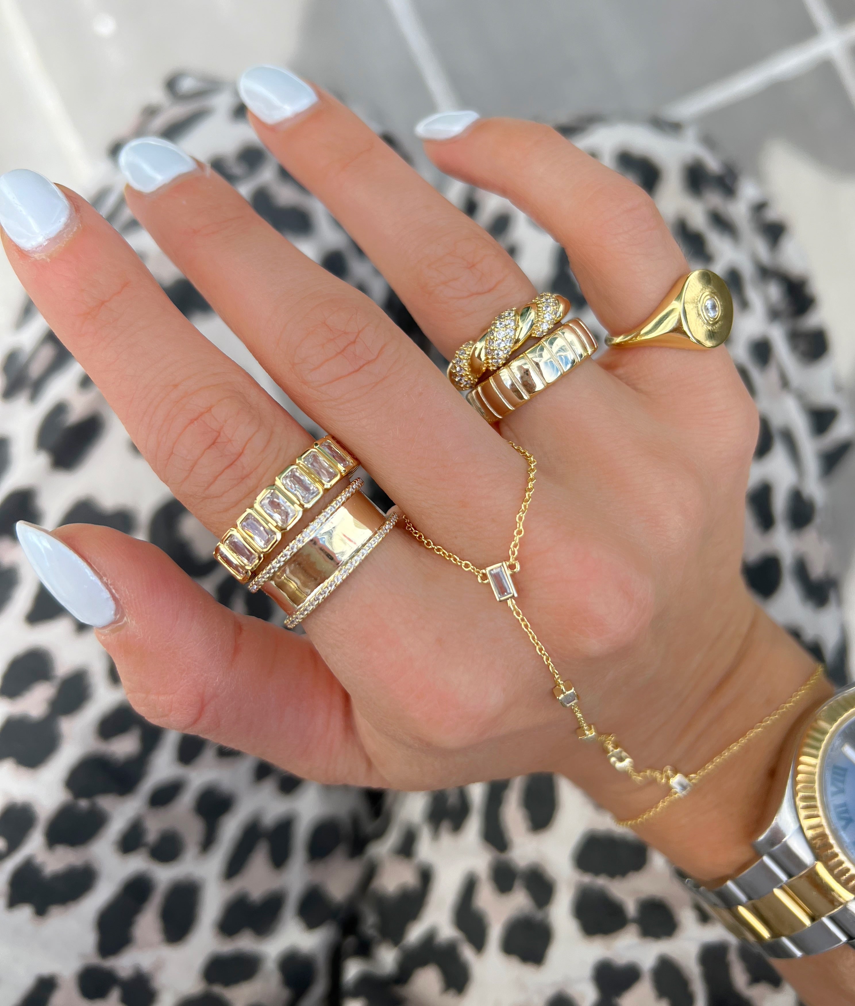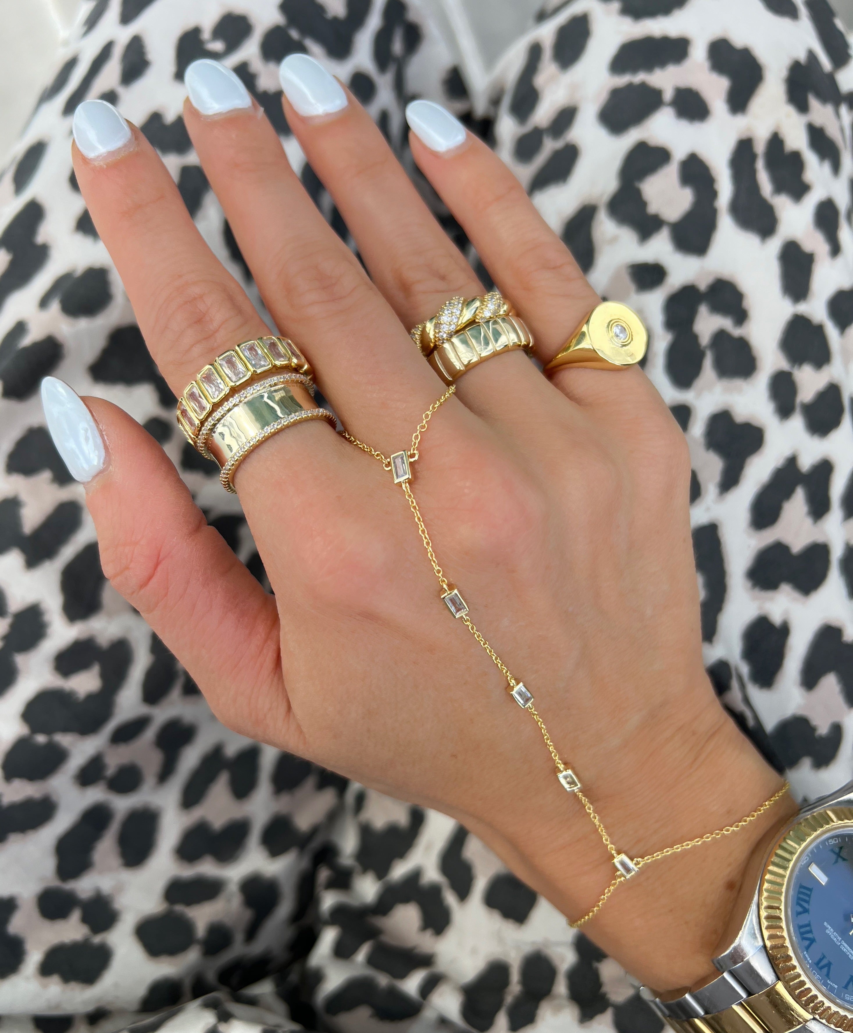Baguette cubic zirconia hand chain creates a stunning and delicate layered look for any occasion. Layer it with rings and other bracelets and you get an elaborate look that is guaranteed to sparkle and get all the compliments.