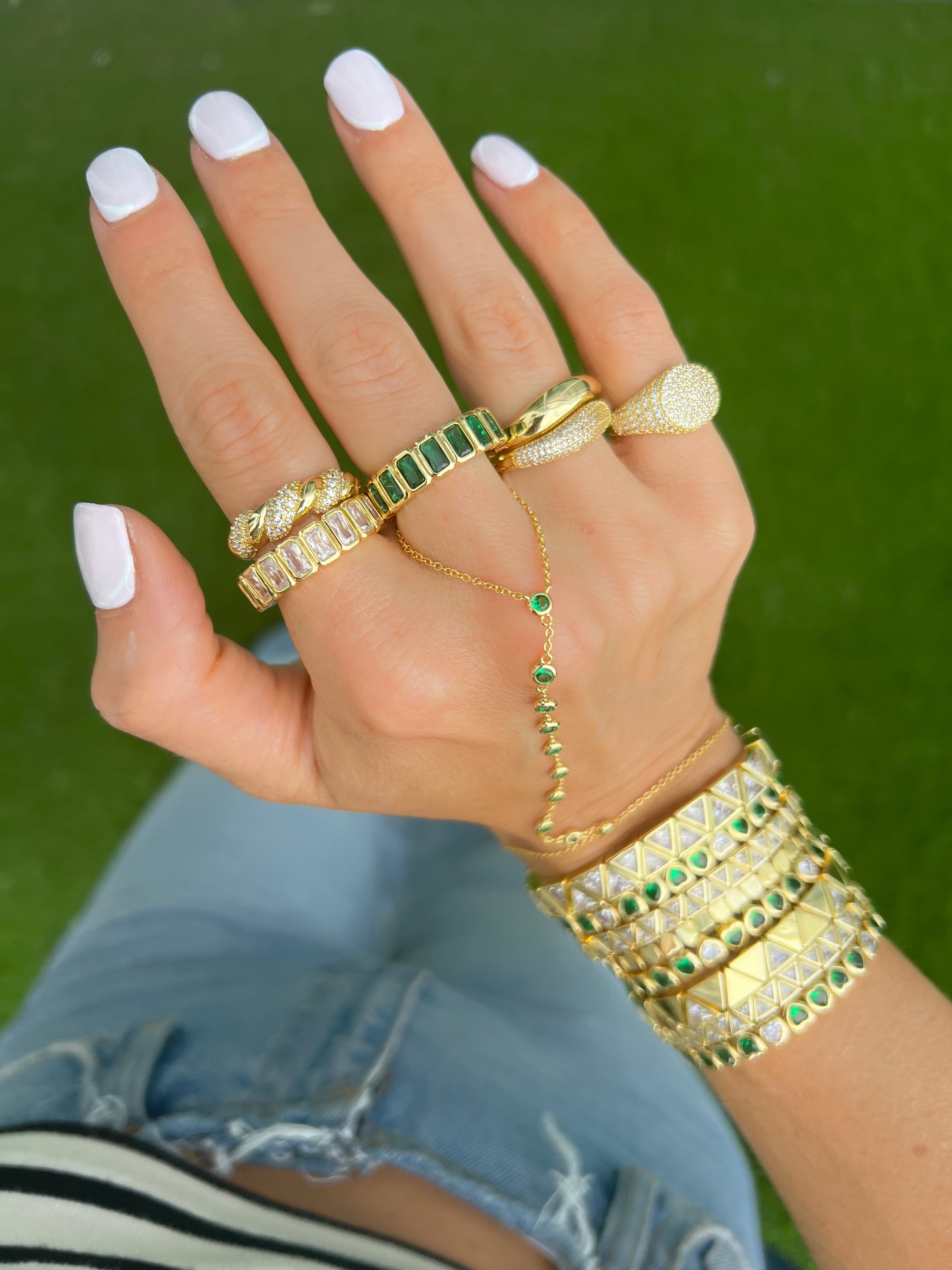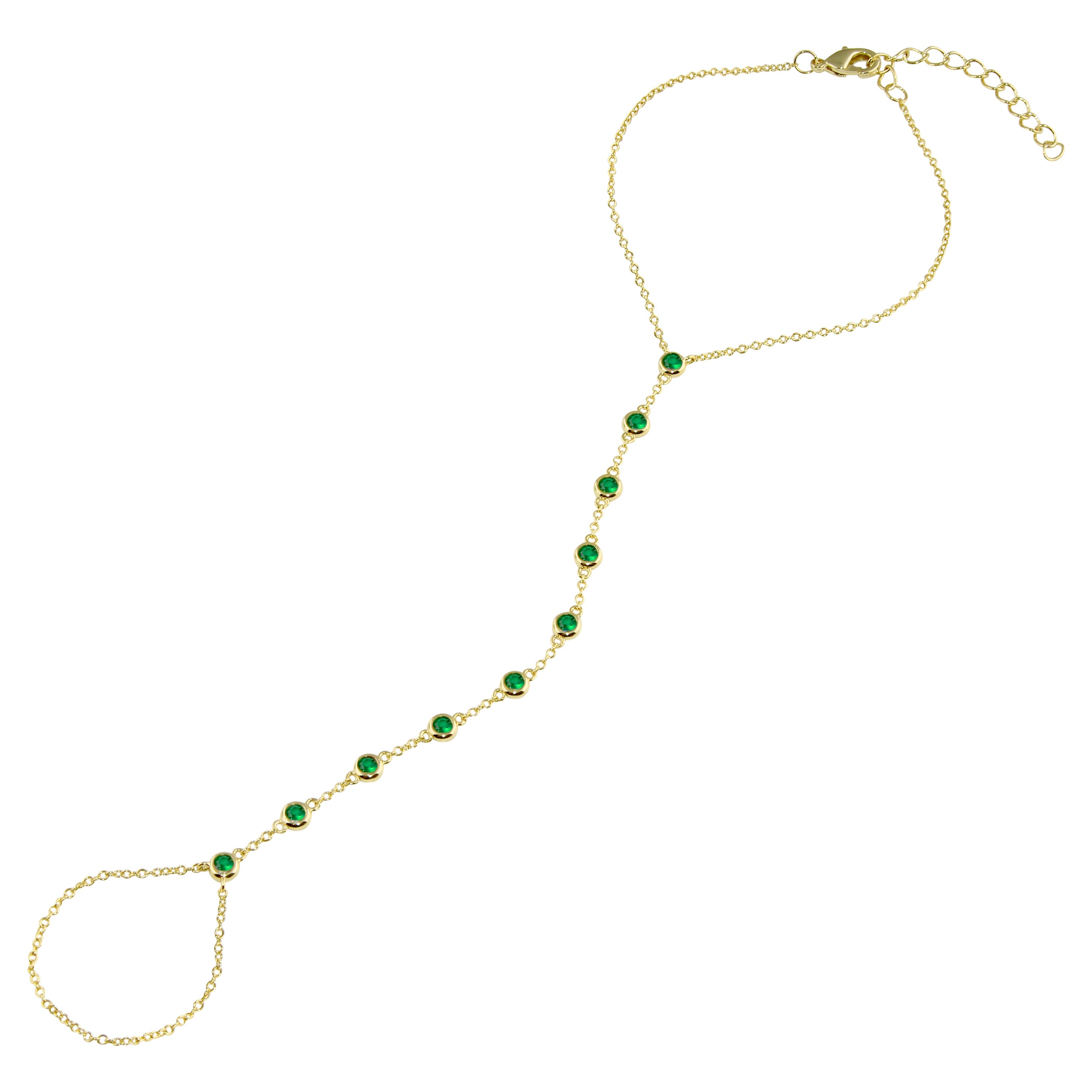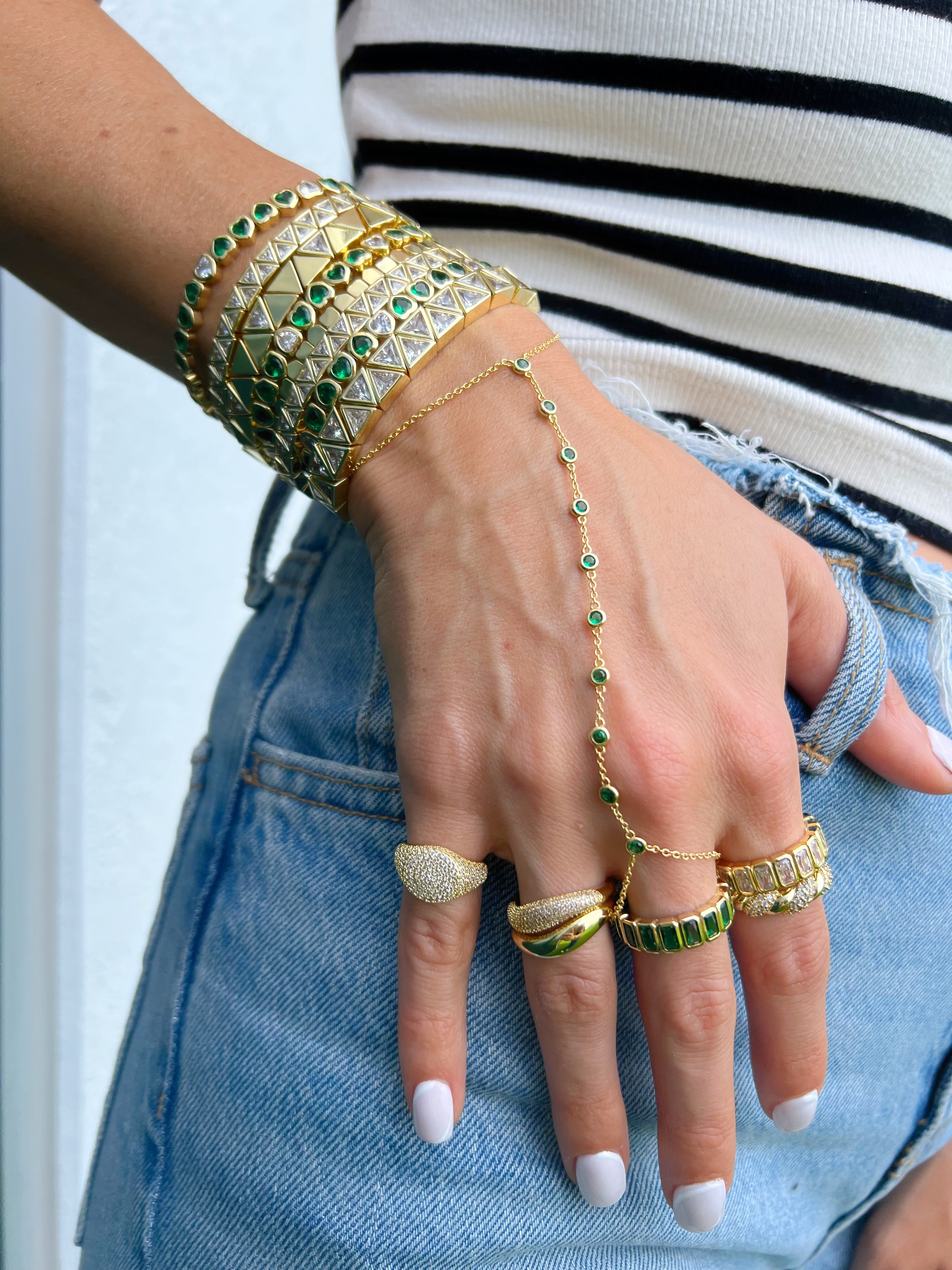 Emerald bezel cubic zirconia hand chain creates a stunning and delicate layered look for any occasion. Layer it with rings and other bracelets and you get an elaborate look that is guaranteed to sparkle and get all the compliments.