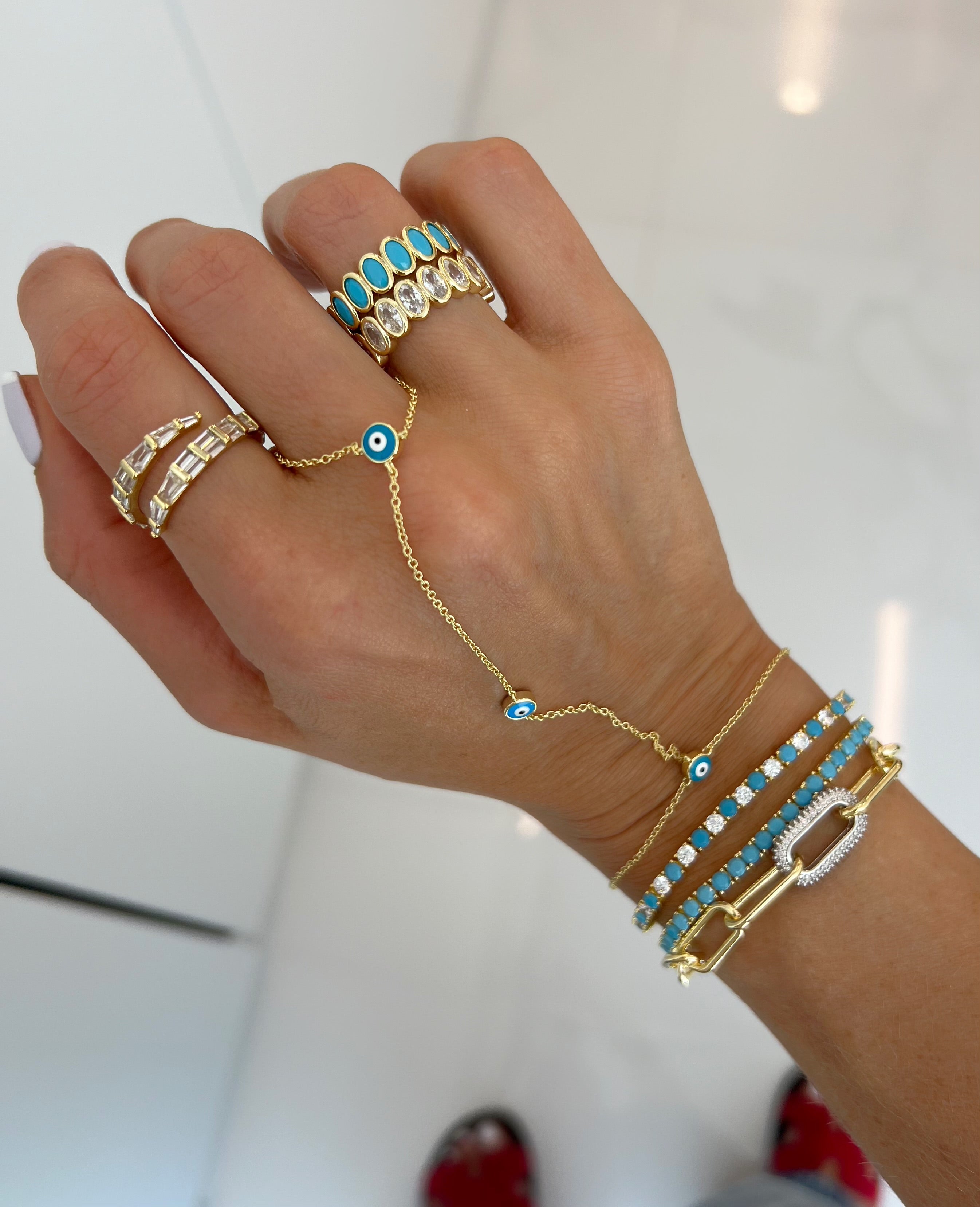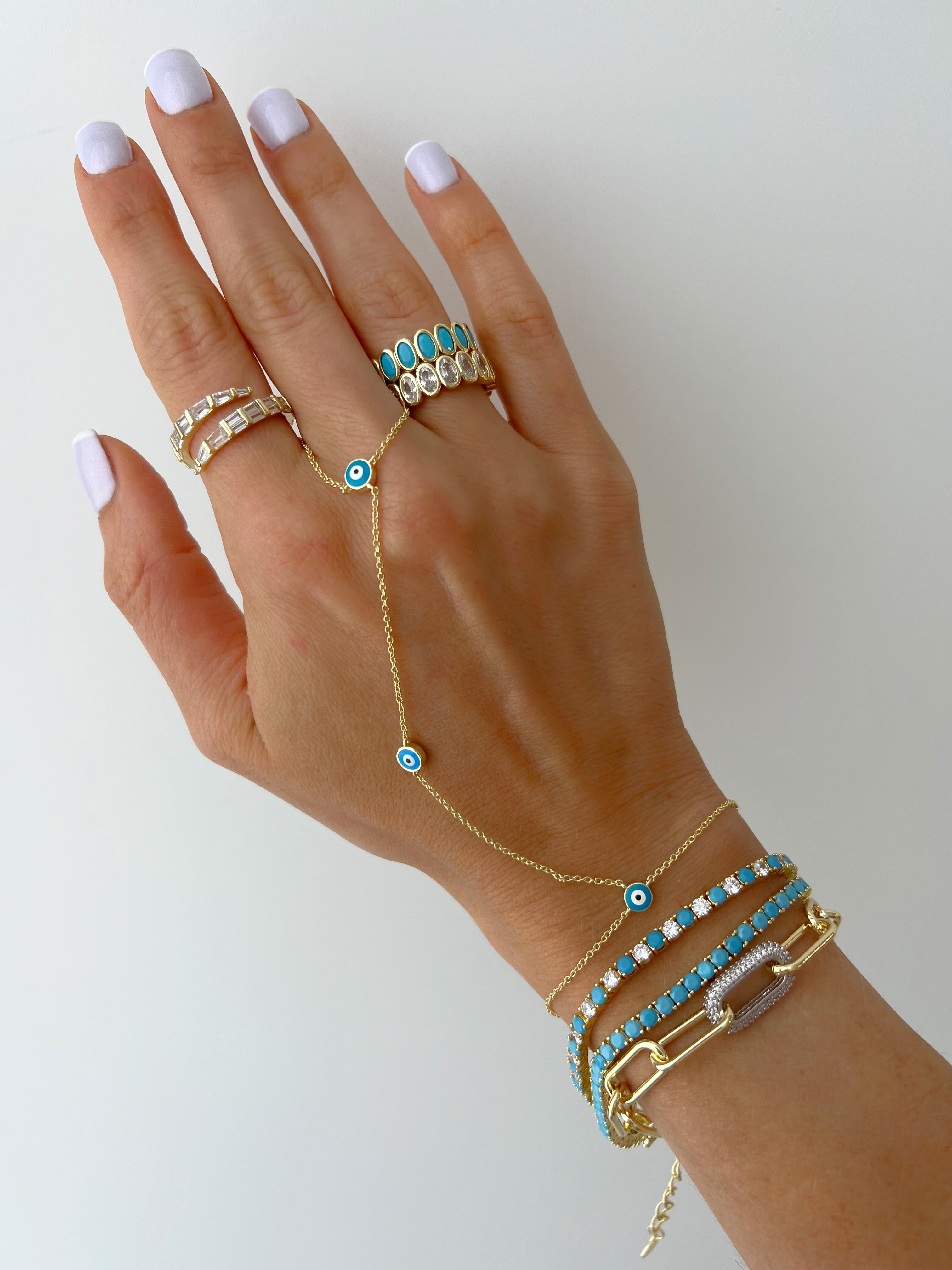 Round Enamel Eye hand chain creates a stunning and delicate layered look for any occasion. Layer it with rings and other bracelets and you get an elaborate look that is guaranteed to sparkle and get all the compliments.