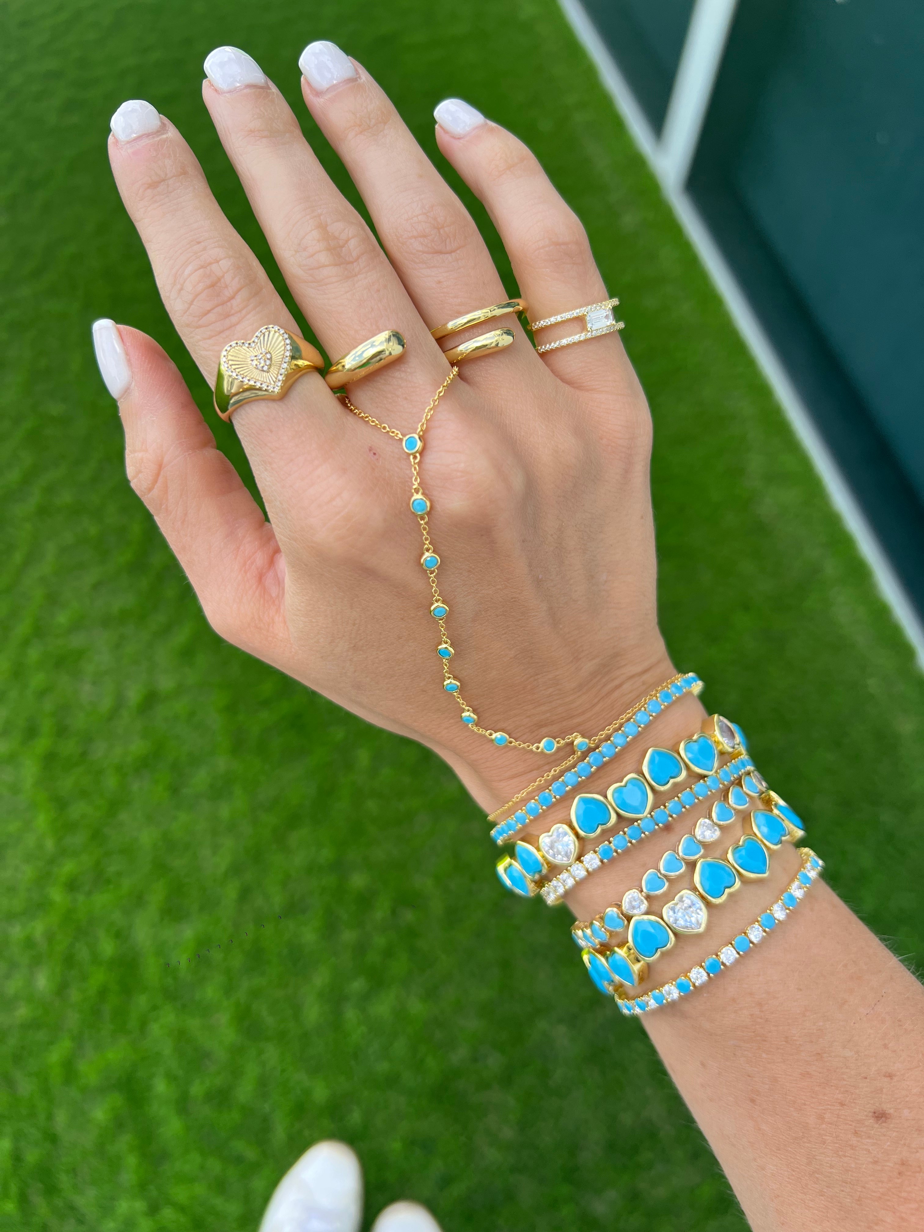 Turquoise bezel cubic zirconia hand chain creates a stunning and delicate layered look for any occasion. Layer it with rings and other bracelets and you get an elaborate look that is guaranteed to sparkle and get all the compliments.