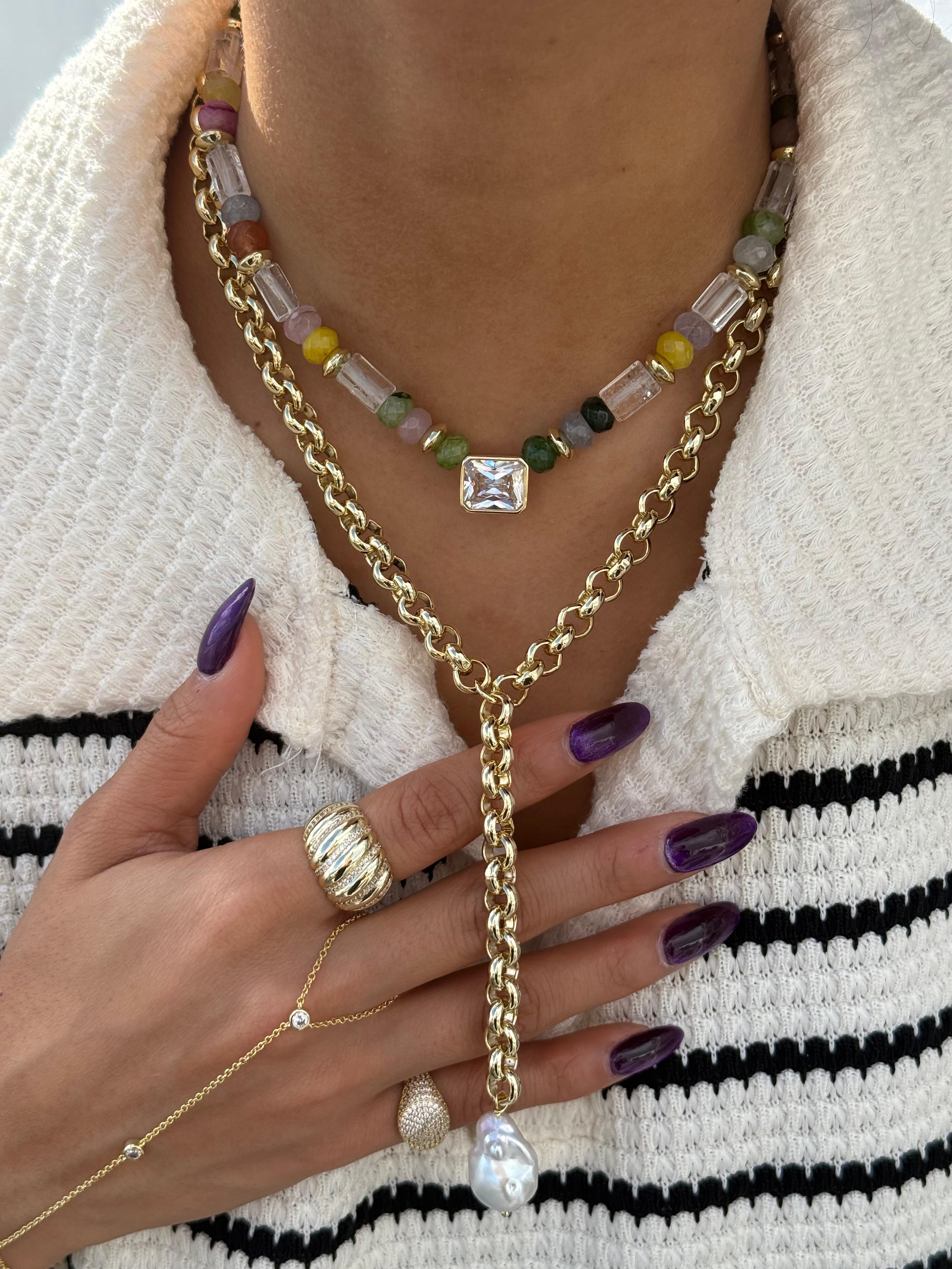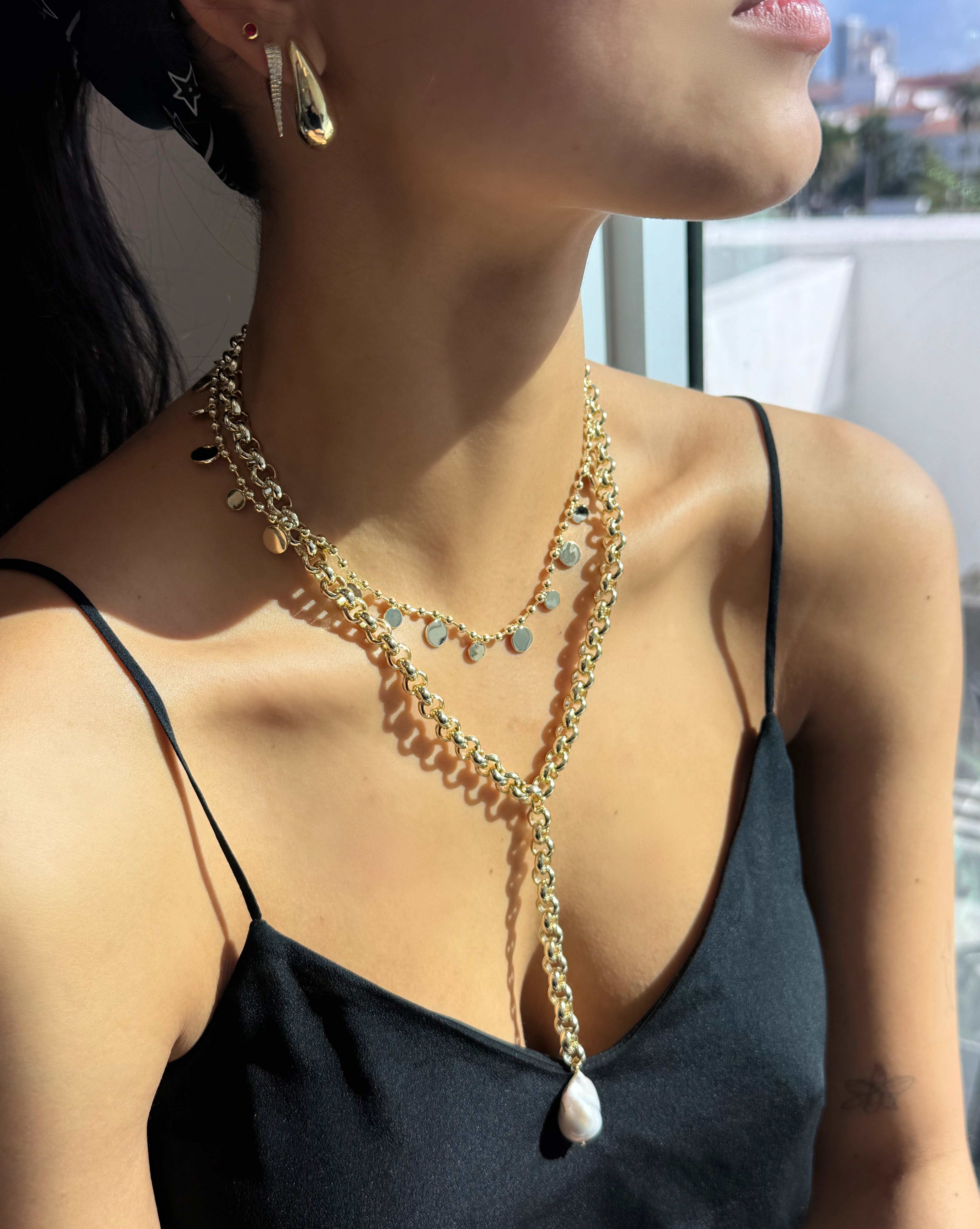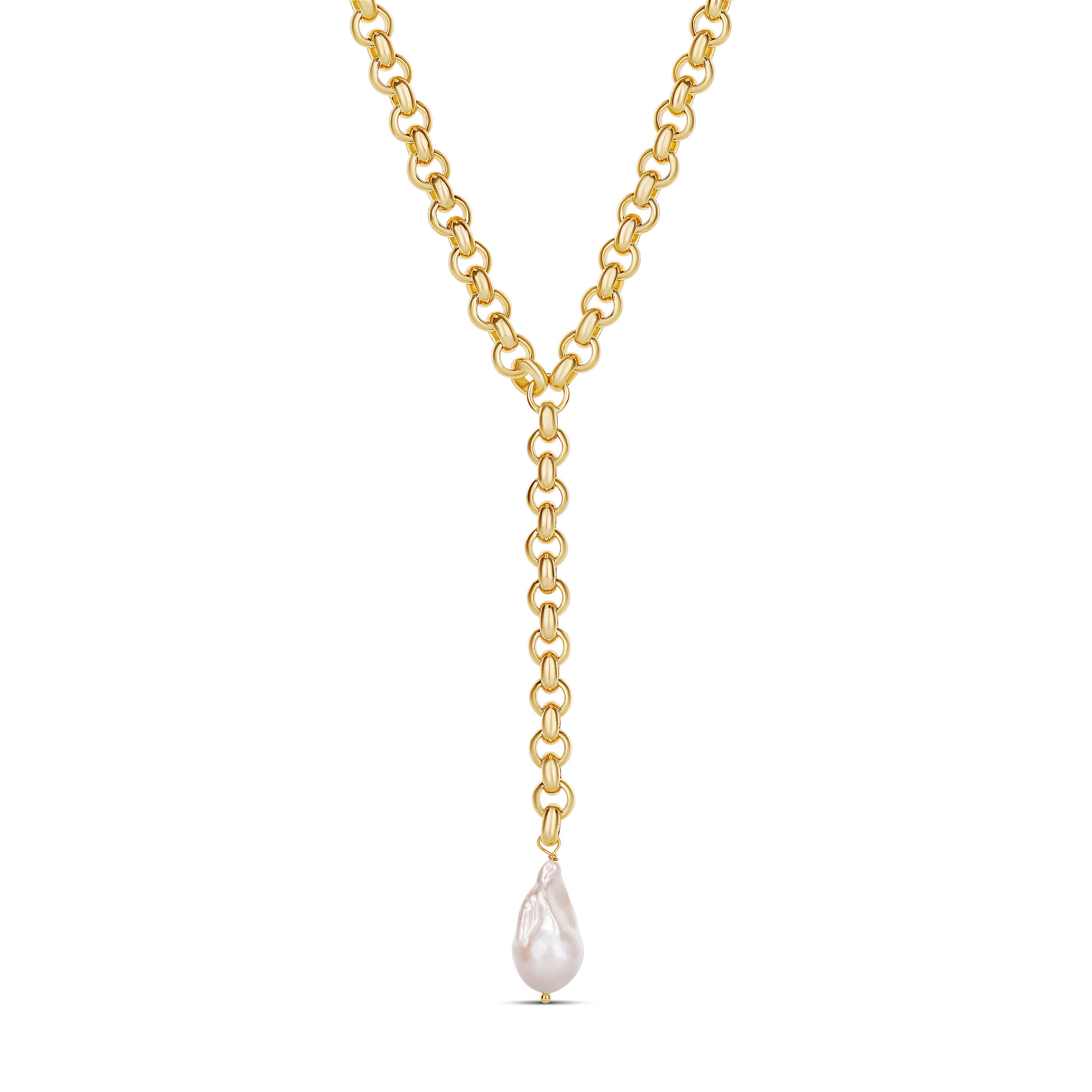 Effortlessly elegant with a modern edge, the Pearl Cascade Y-Necklace features a polished gold link chain that drops into a sleek lariat silhouette, finished with a luminous baroque pearl. The organic shape of the pearl adds soft movement and natural beauty, while the bold chain brings a contemporary feel. Perfect for layering or wearing solo, this piece elevates any neckline with understated luxury and timeless charm.