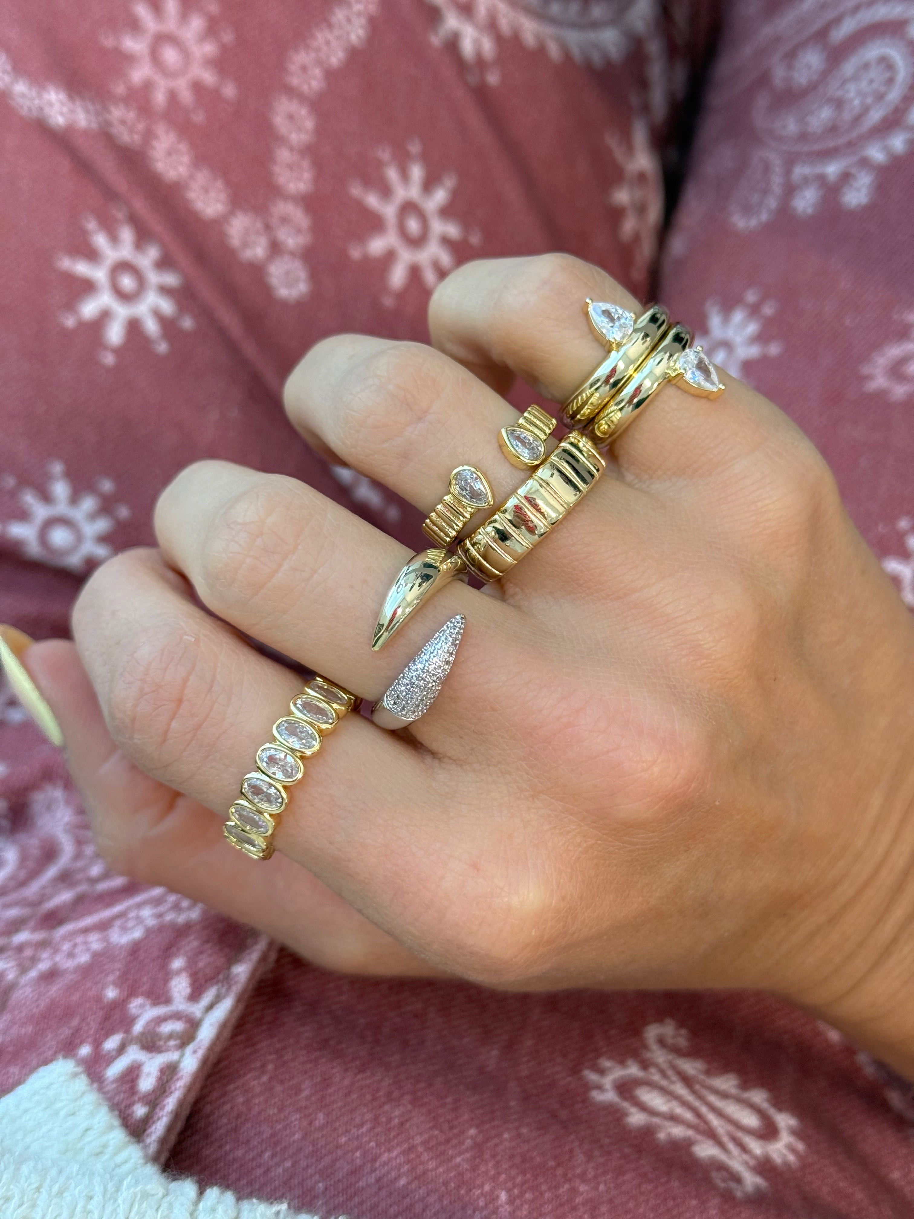 Bold meets elegance in this sculptural open ring. One end curves into a smooth golden claw, while the other glistens with pavé-set stones for a touch of sparkle. Crafted in polished silver with a modern two-tone finish, it's the perfect piece for stacking or standing solo. A true statement of power and grace.
