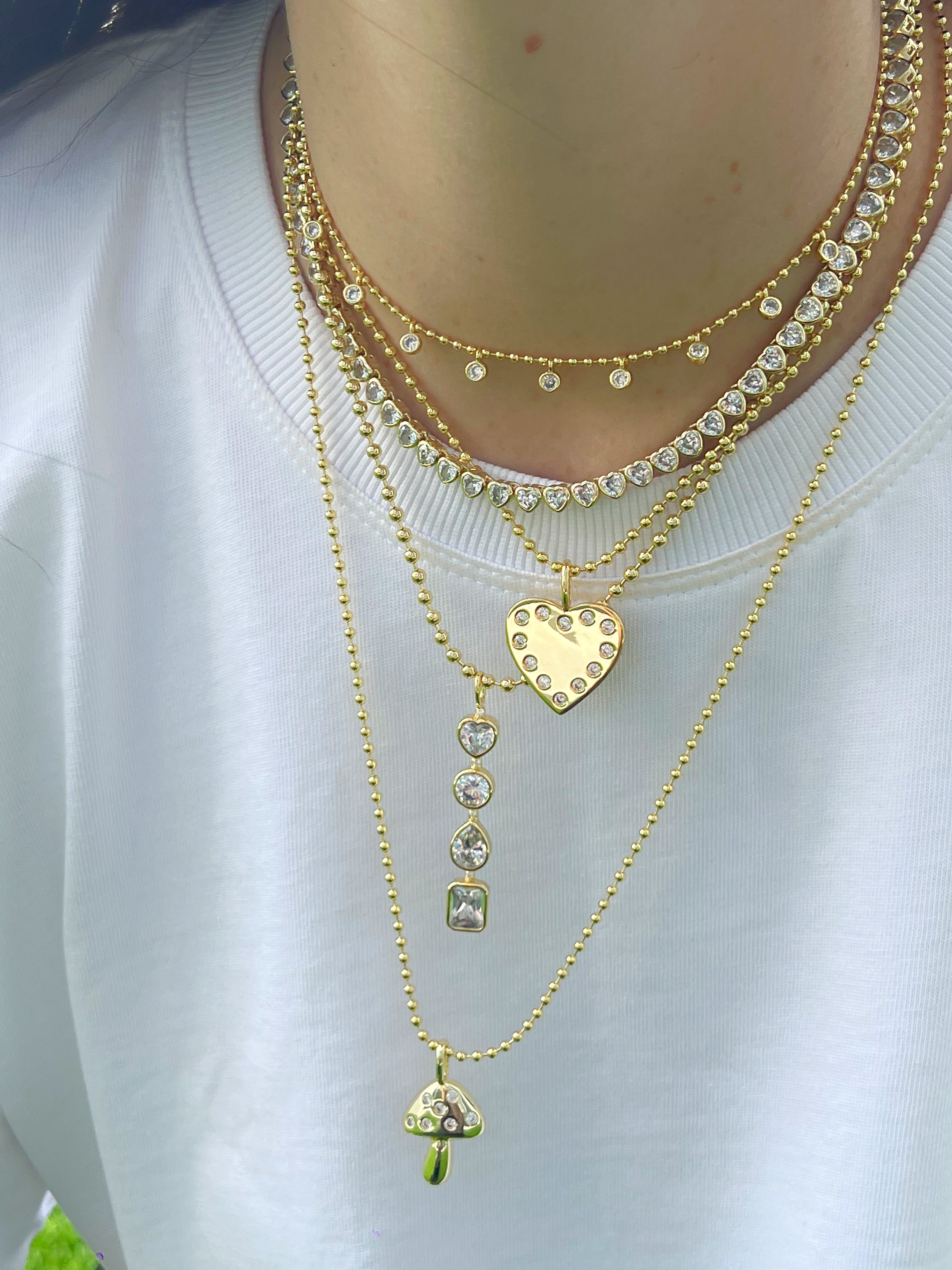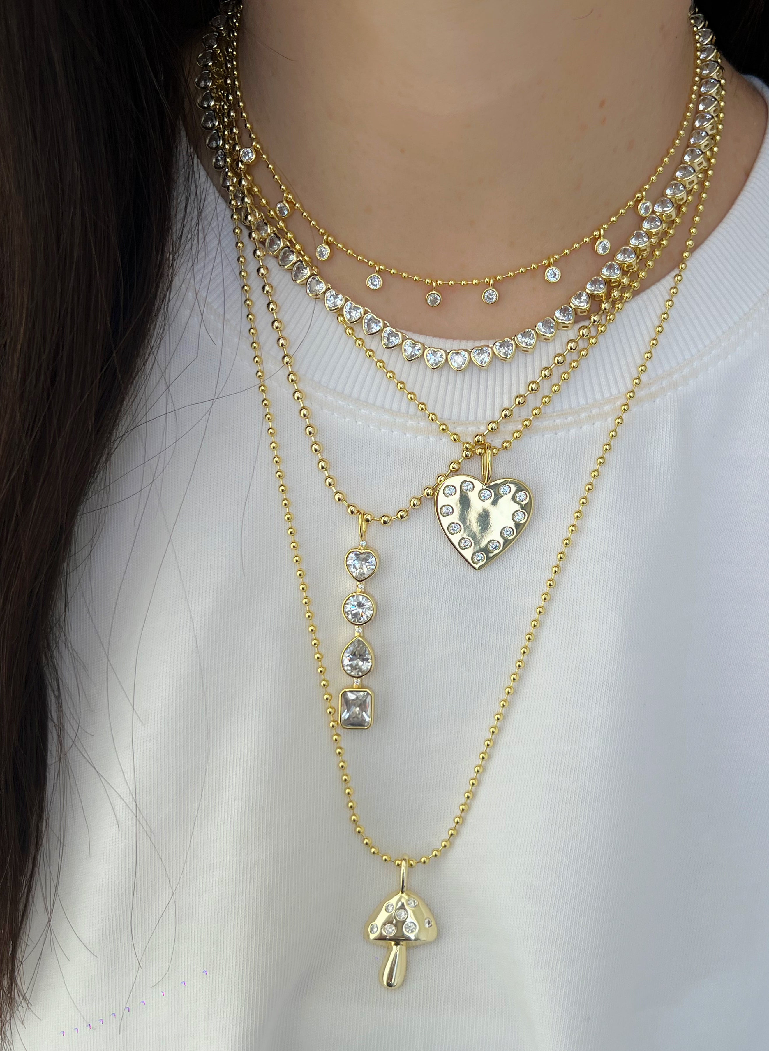 A brilliant heart pendant cast in gleaming yellow gold plated inlaid with a border of white gemstones.