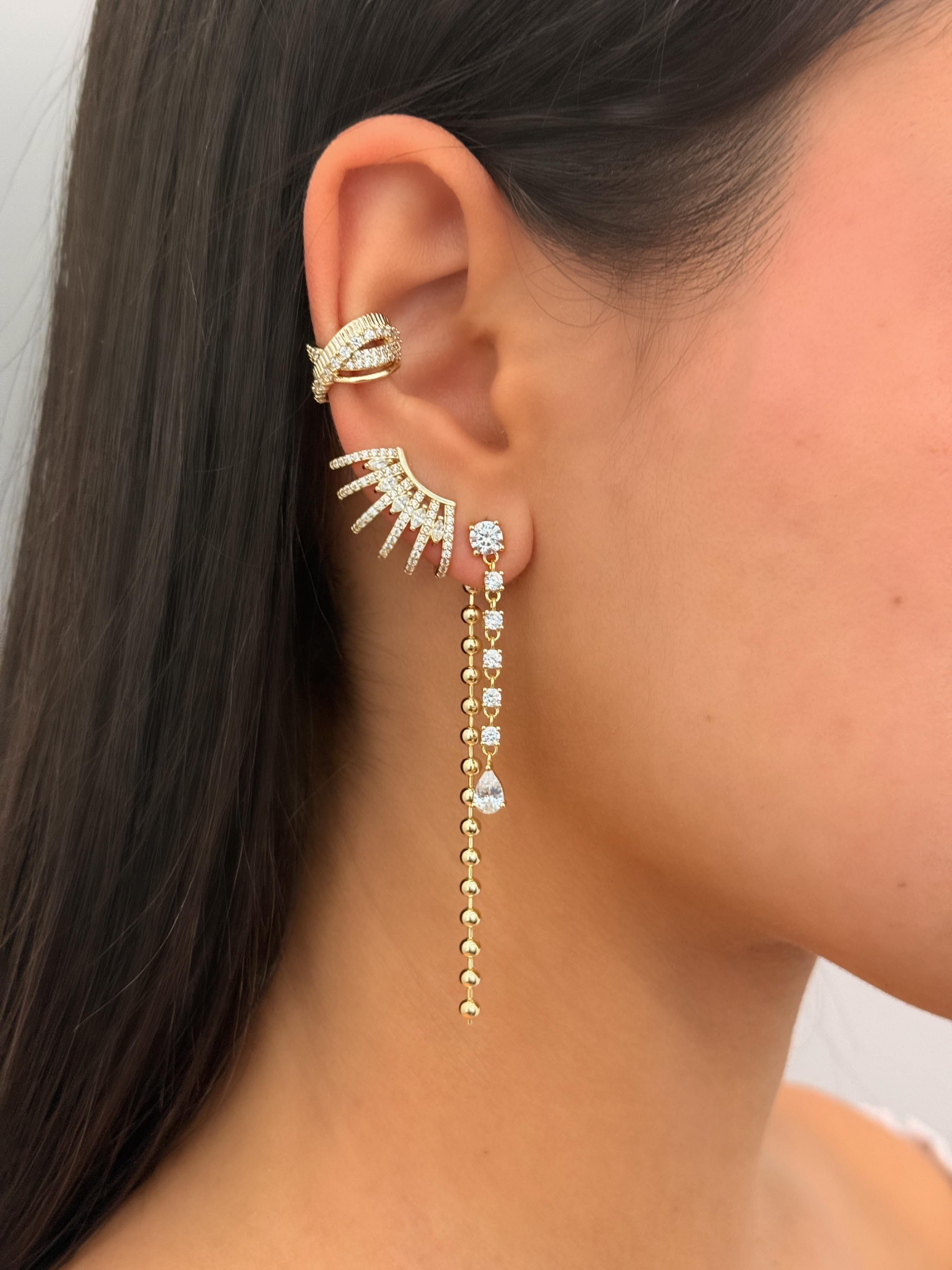 Bold texture meets refined sparkle. The Golden Armor Ear Cuff features sculpted ridged gold layers wrapped in rows of brilliant pavé stones, creating a dimensional, high-luxury look without the need for piercing. Designed to hug the ear comfortably, this statement piece delivers instant edge and elegance—perfect for stacking or wearing solo when you want all eyes on you.