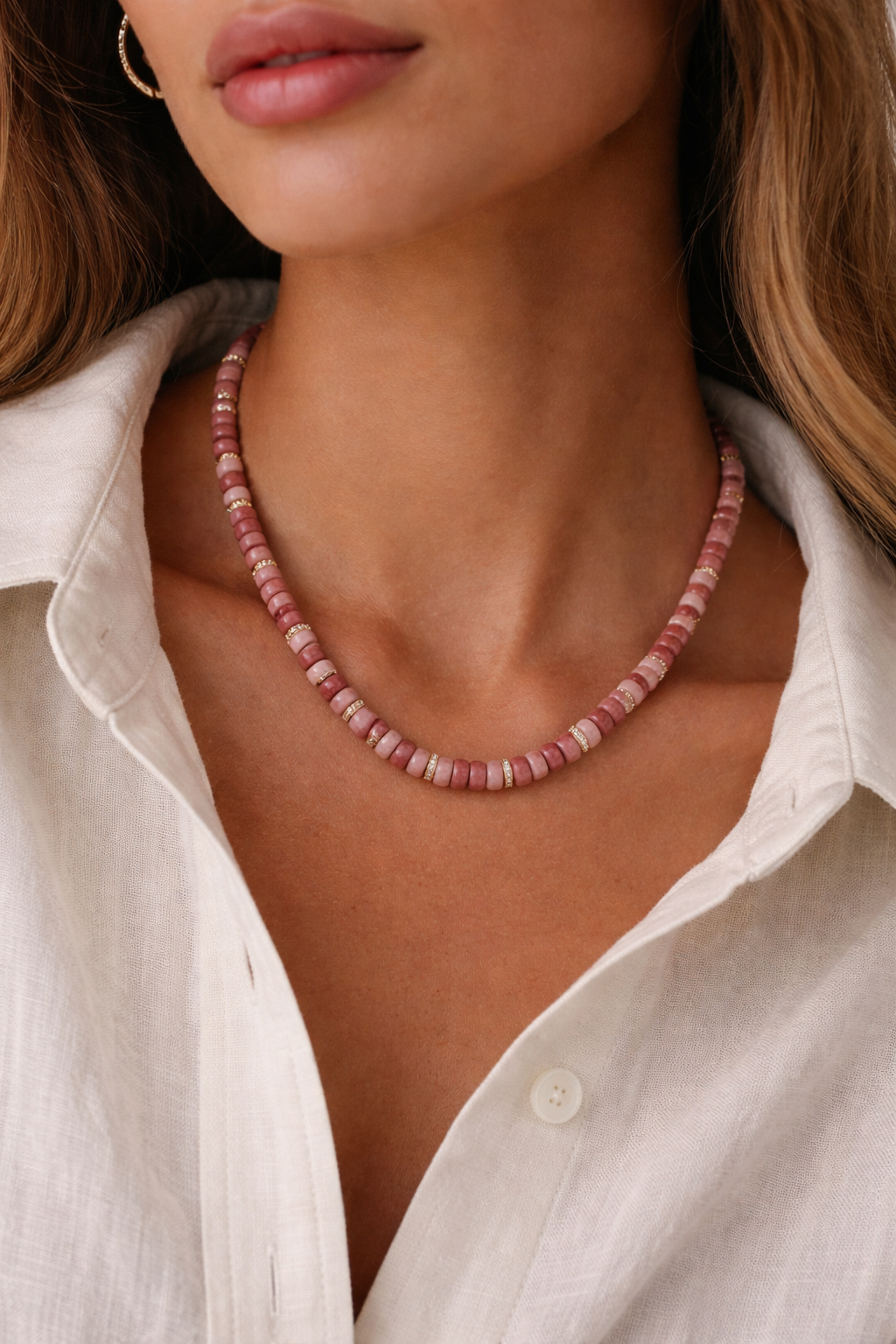 Feminine, luminous, and effortlessly elevated. The Blush On The Rocks Necklace features natural stone beads in soft blush and rose tones, accented with signature pavé spacers that add the perfect hint of sparkle. Designed to bring warmth and texture to your stack, this piece blends delicate color with bold JTG attitude. Elegant enough to wear solo and perfect for layering, it’s your everyday glow—refined.