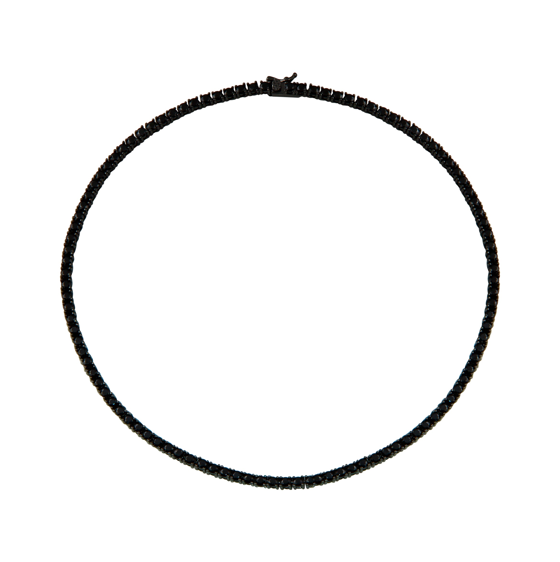 A series of impacting black rhodium stones linked together in an elegant black chain. Serves rock-and-roll vibes whether worn solo or in a stack.