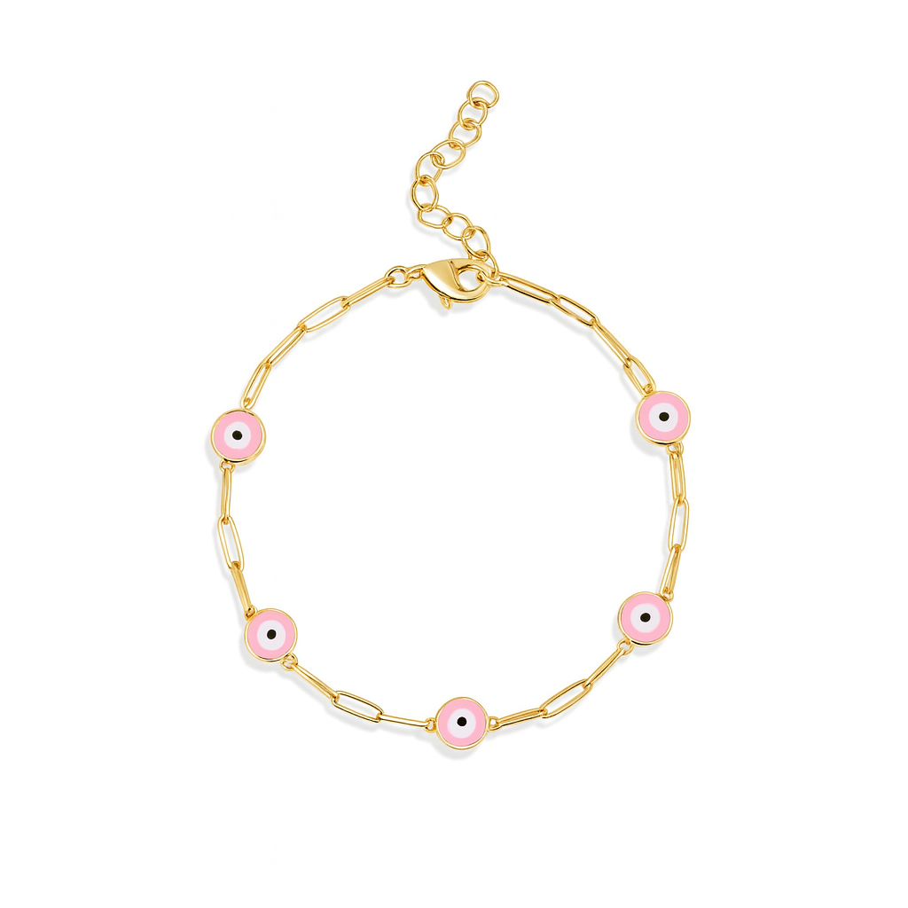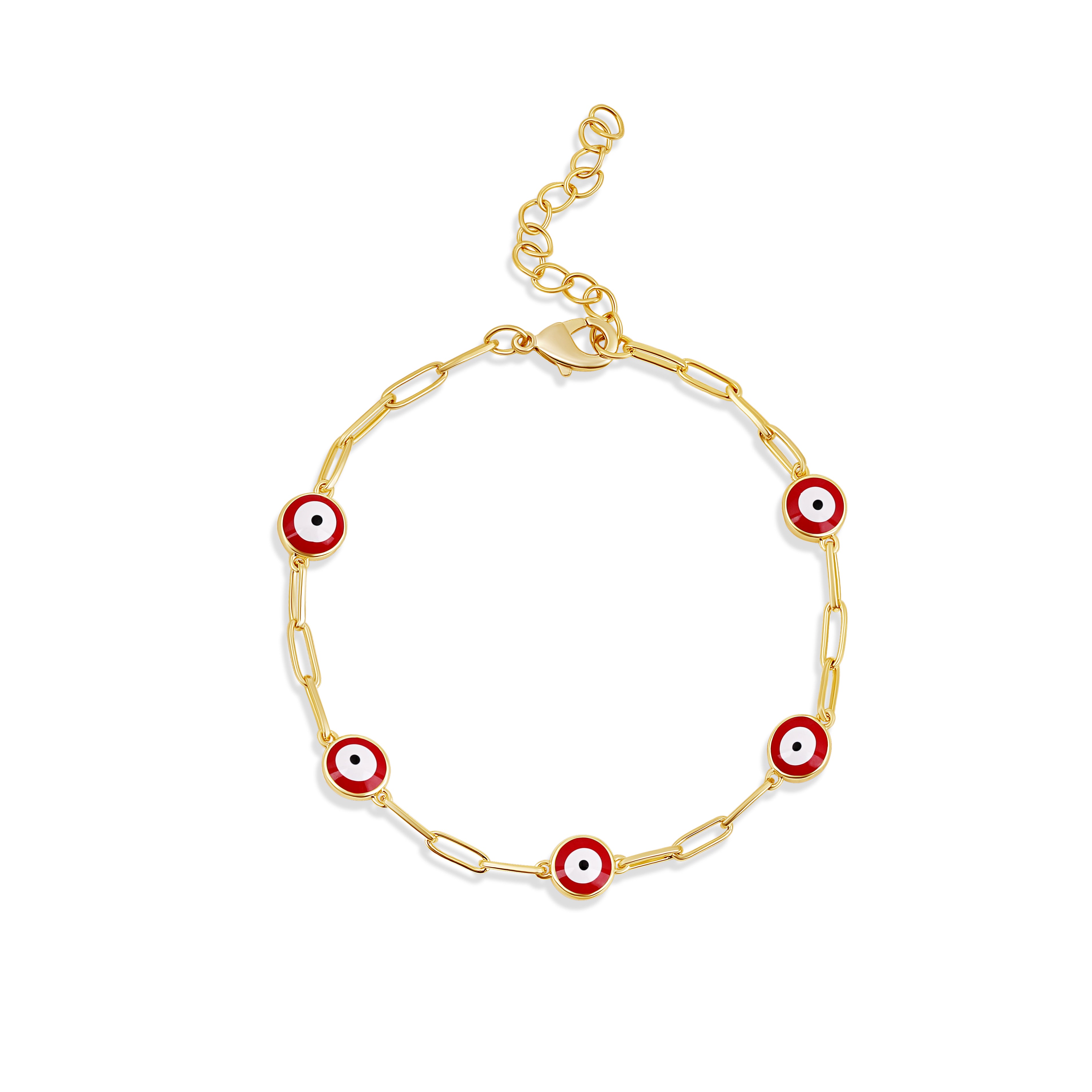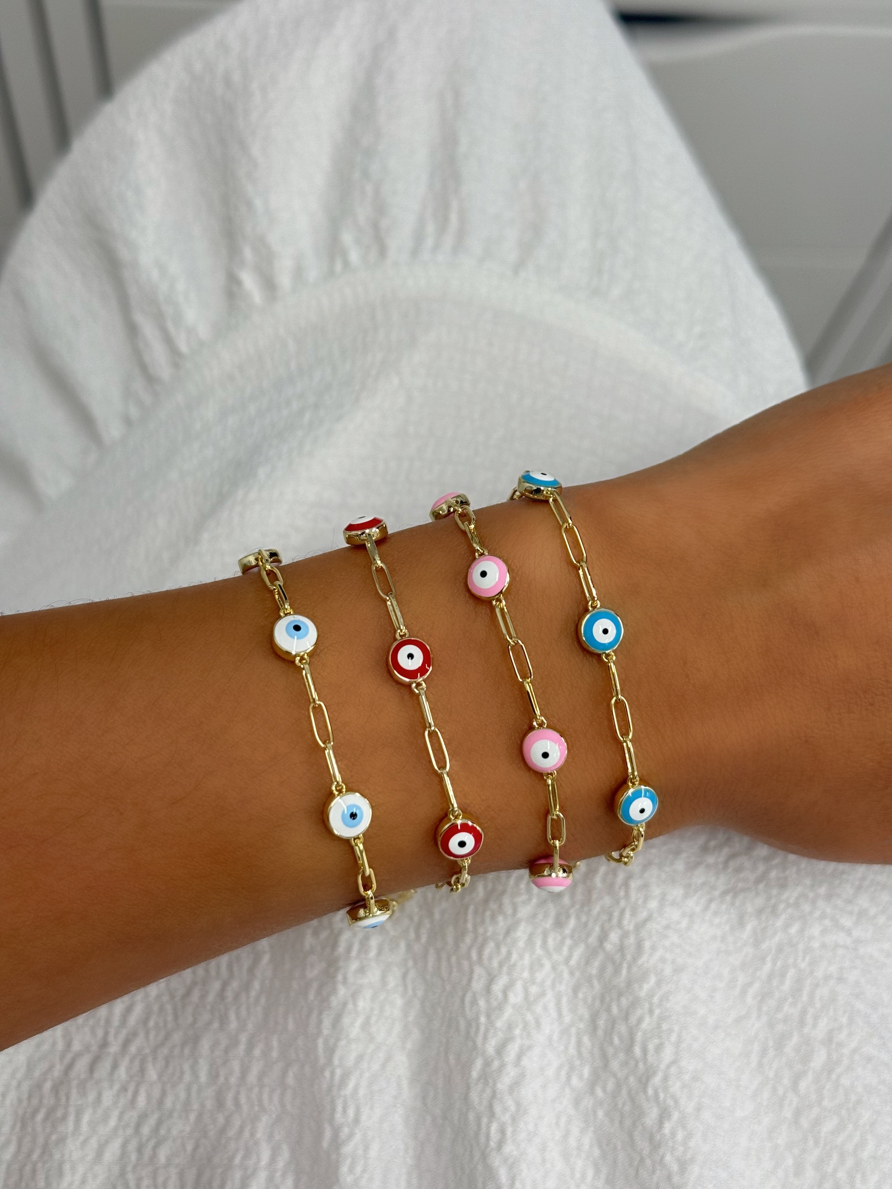 Your new everyday-good-luck charm. This bracelet features a sleek yellow-gold paperclip chain accented with glossy turquoise evil-eye stations that add color, shine, and protection in one modern piece. Lightweight, waterproof, and perfect for stacking, it brings that effortless JTG sparkle to any wrist stack while keeping the iconic evil-eye style fresh and chic.