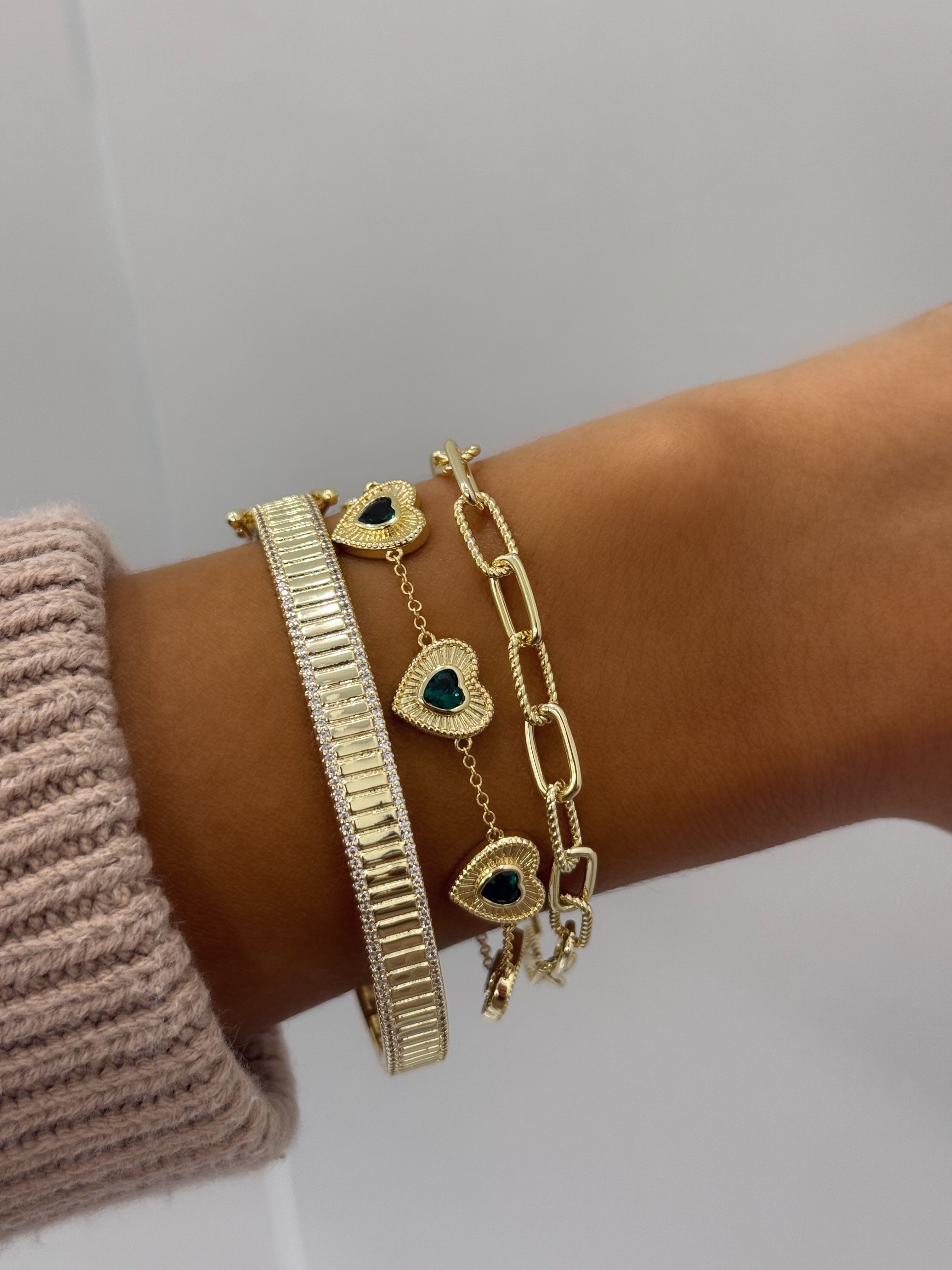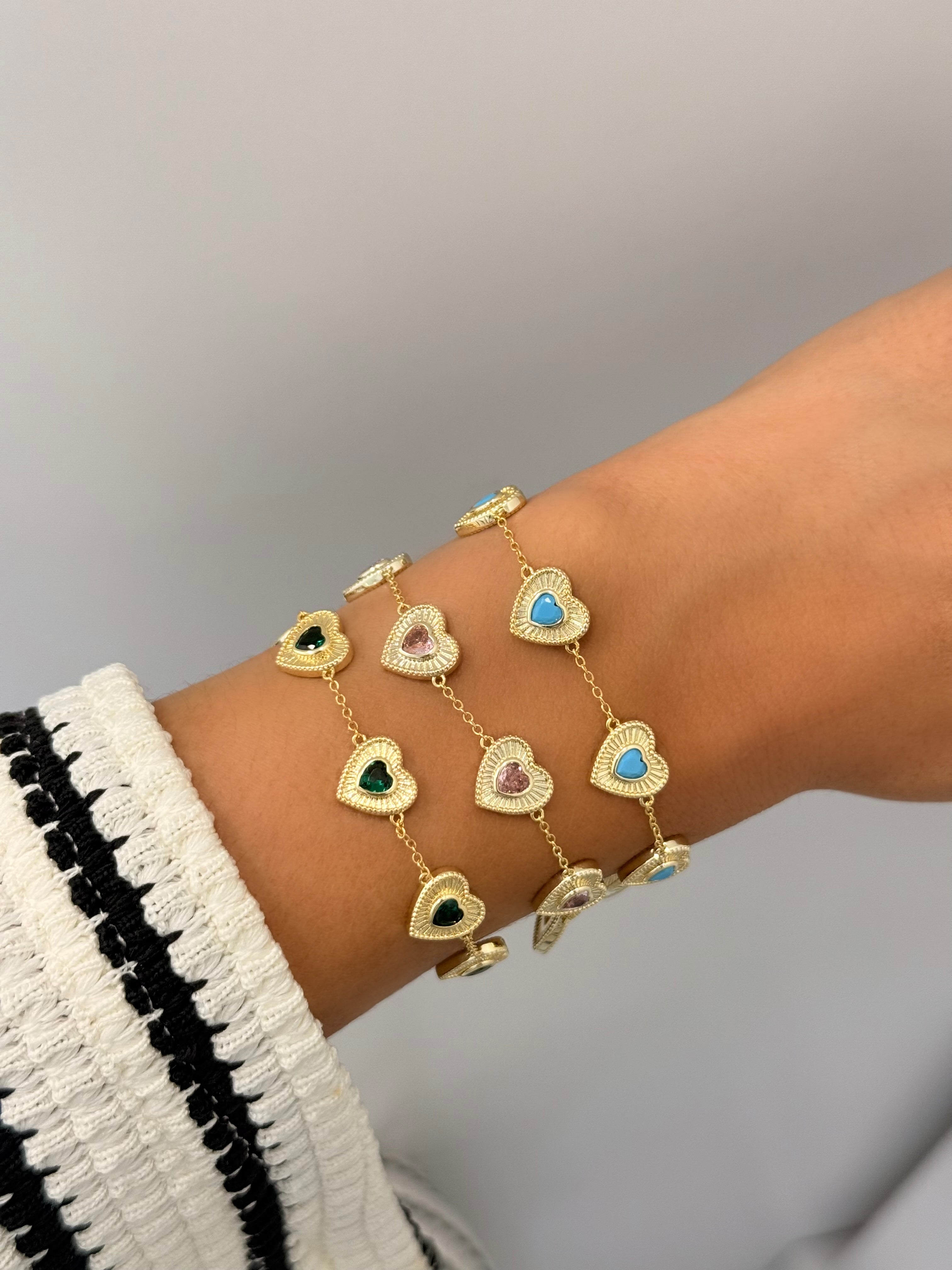 A delicate ode to elegance and love. Five shimmering heart stations are arranged along a refined gold chain, each one set with a rich emerald-green, pink or turquoise stone and framed in a beautifully detailed gold bezel. Vibrant yet effortlessly refined, this bracelet adds the perfect hint of color and sparkle to your everyday stack.