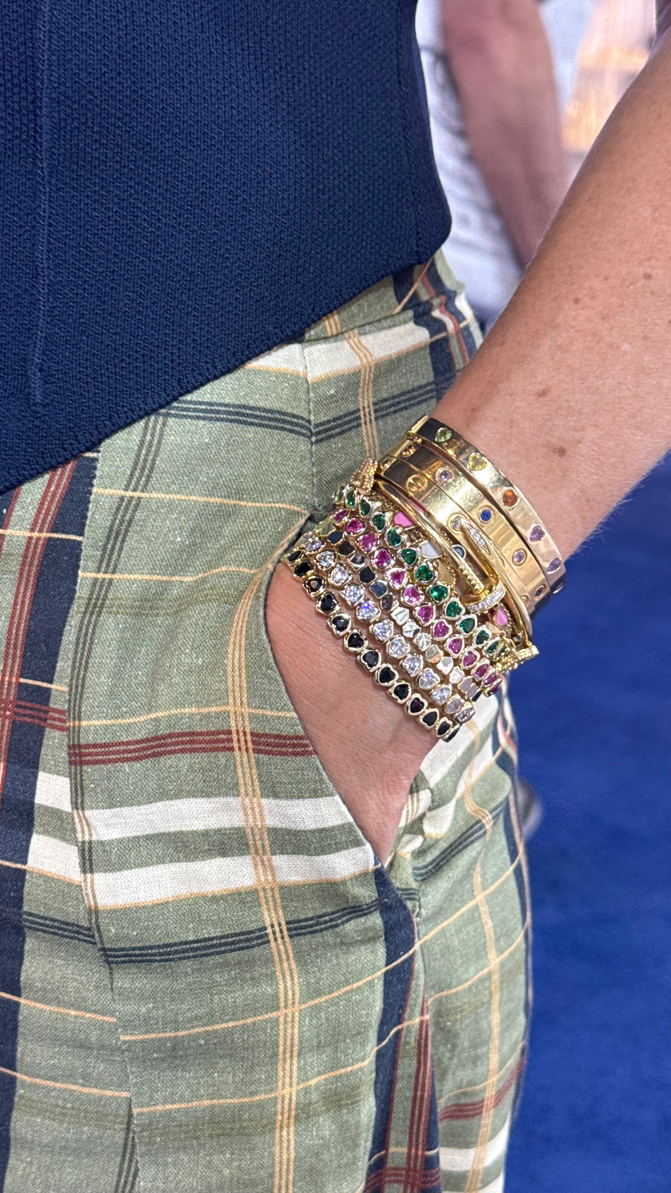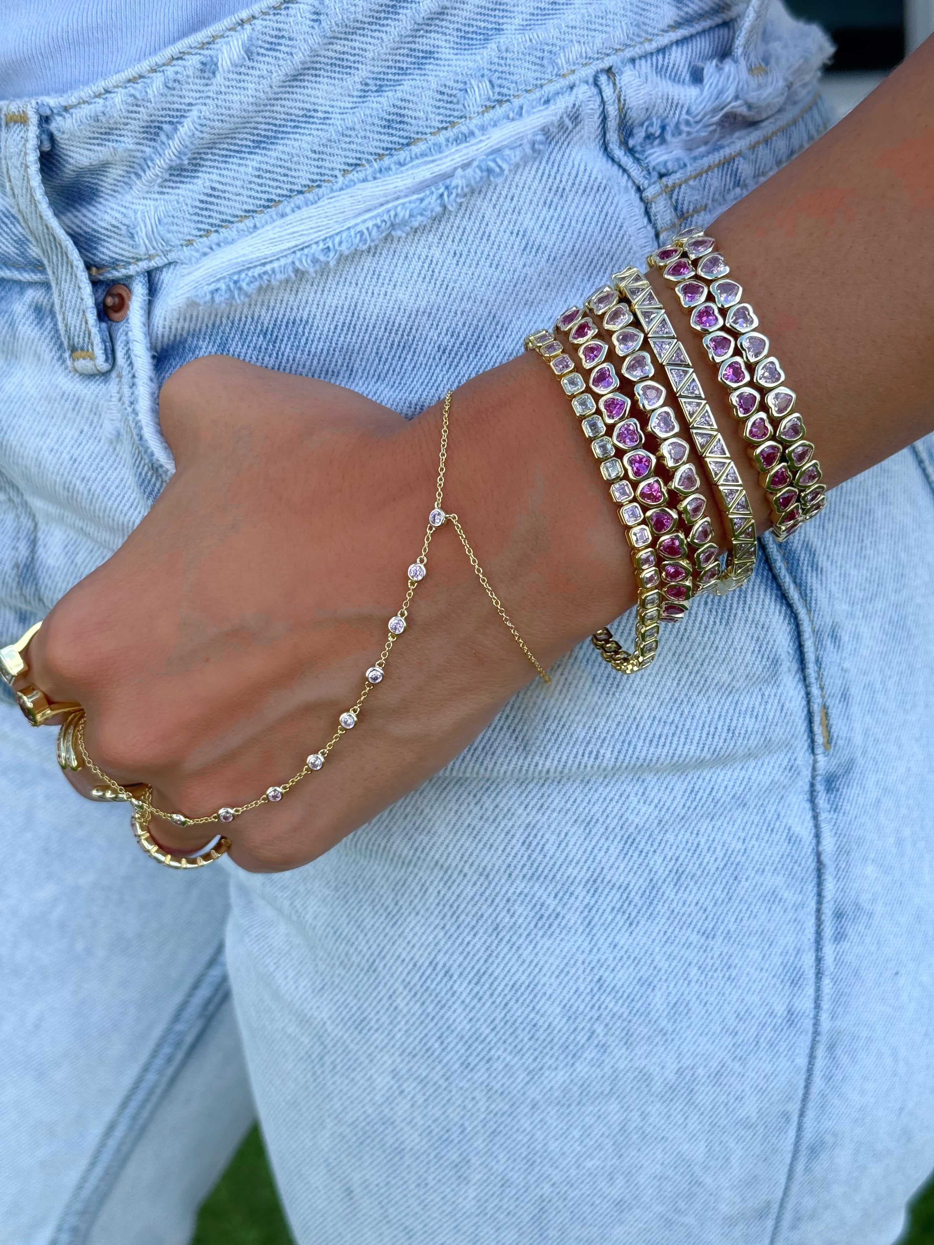 Bold yet timeless, this bracelet is all about everyday luxury. Featuring a continuous row of glossy hot pink heart-shaped stones framed in rich 18K gold plating, it’s a chic twist on a classic silhouette. The stretch design ensures an effortless, comfortable fit—perfect for stacking or wearing solo.