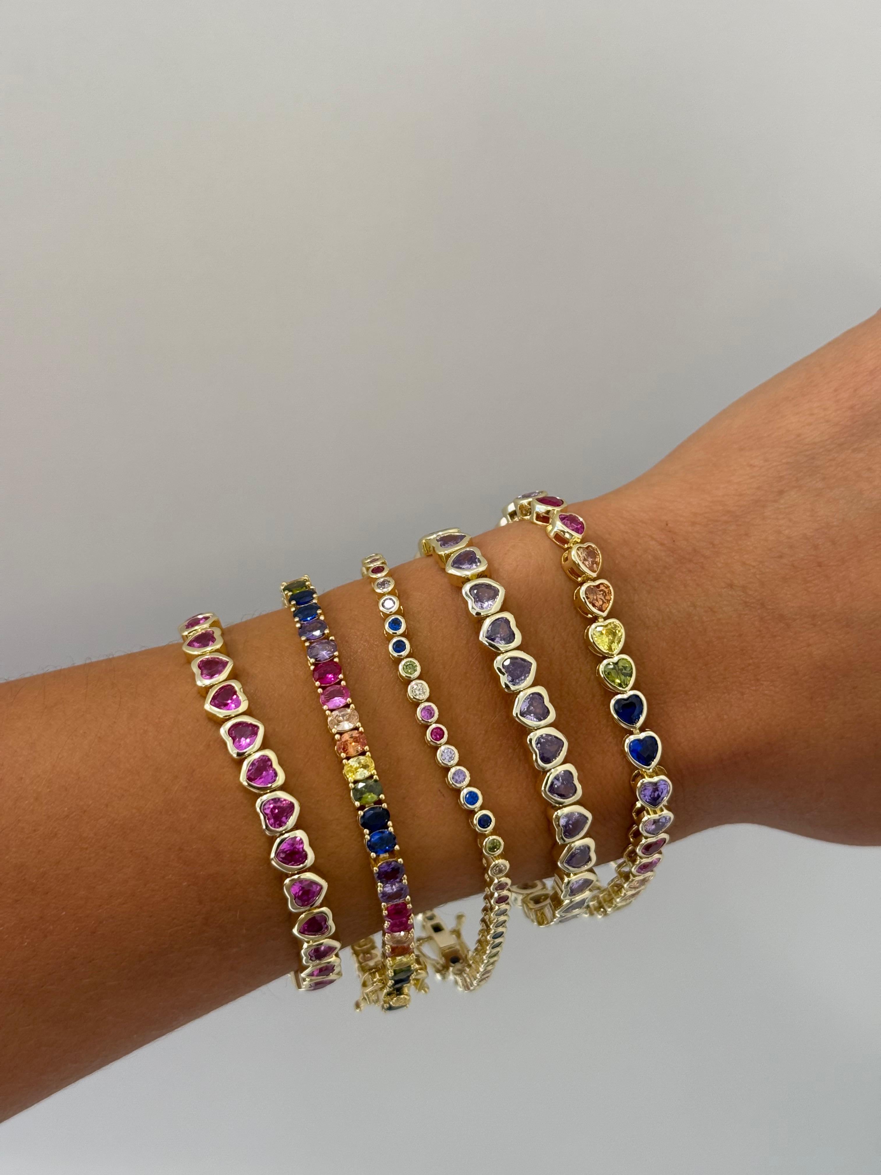 This gold-plated tennis bracelet features a gradient of vibrant, hand-set stones — from deep sapphire to fuchsia and warm amber — designed to sparkle from every angle.