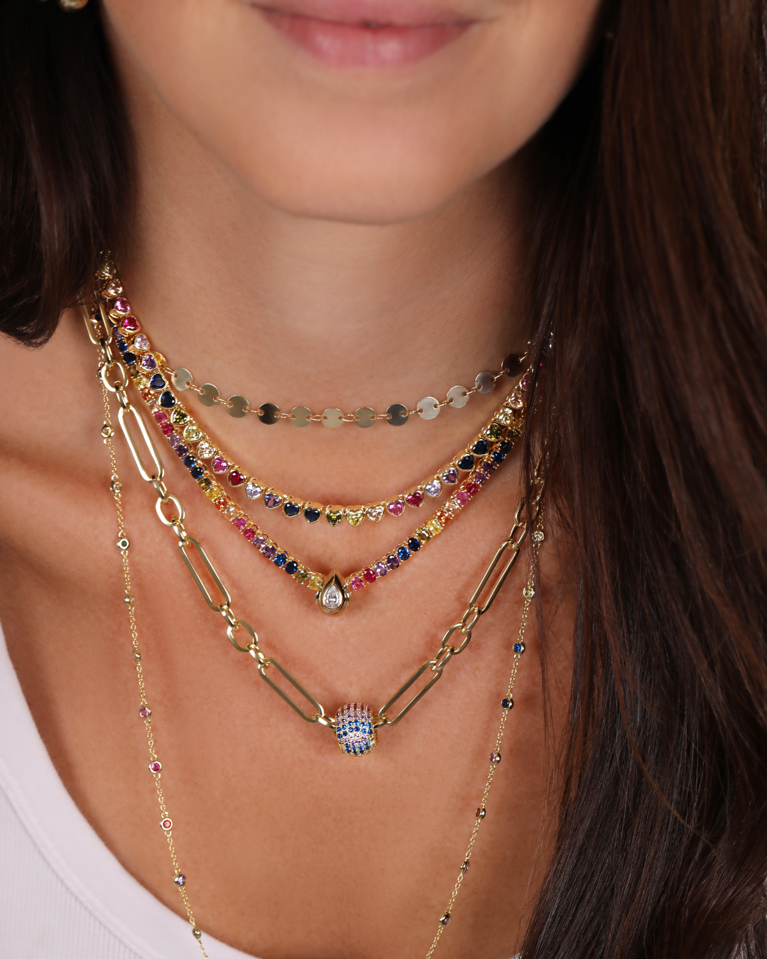 This gold-plated tennis necklace features a gradient of vibrant, hand-set stones — from deep sapphire to fuchsia and warm amber — designed to sparkle from every angle.