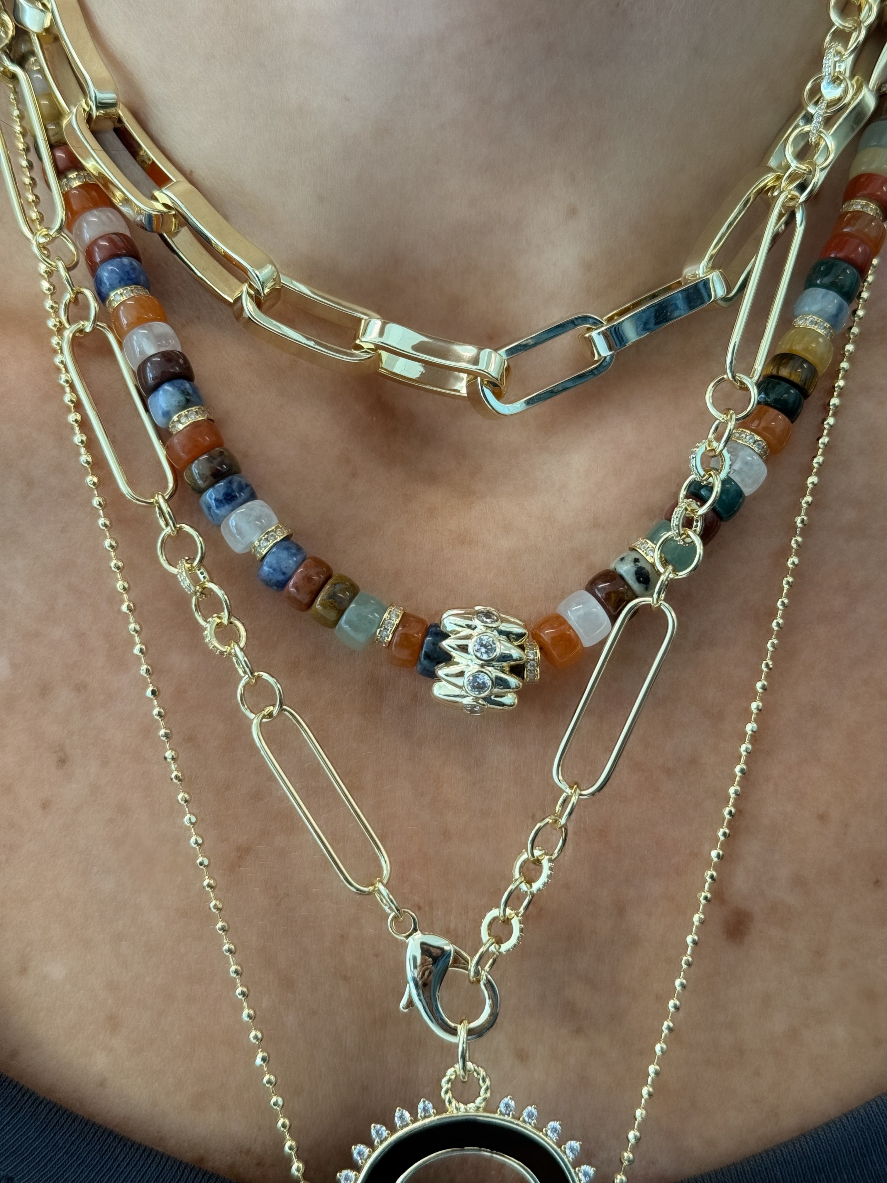 Edgy, bold, and refined. The Spike Spacer features vivid sapphire-blue, turquoise or emerald stones set into sculptural spike-shaped gold forms, creating a powerful contrast between brilliance and structure. The high-polish gold finish enhances the depth and intensity of each stone, making it the perfect statement accent to elevate any necklace or bracelet. Designed to add dimension, shine, and signature JTG attitude to your stack.