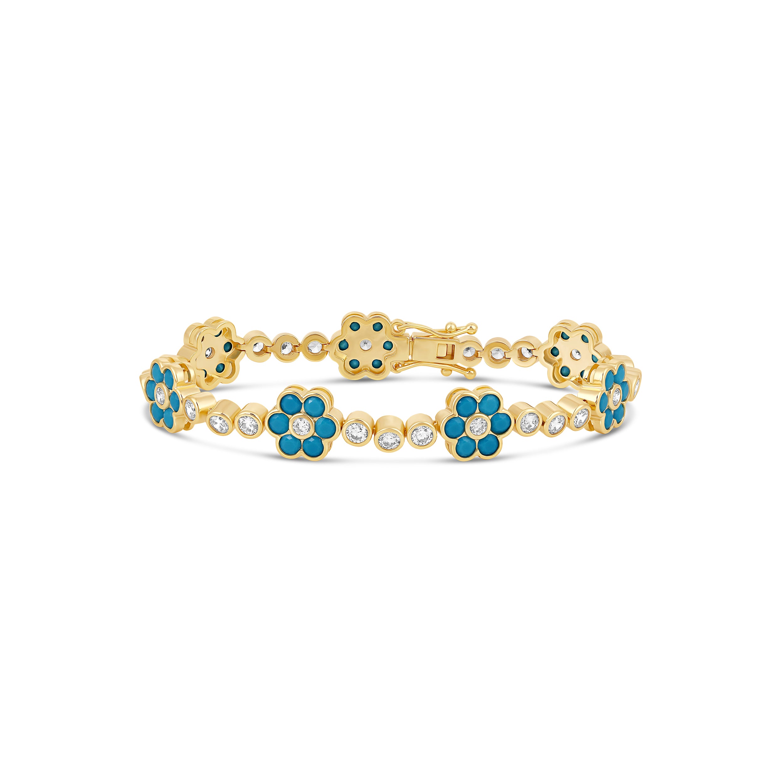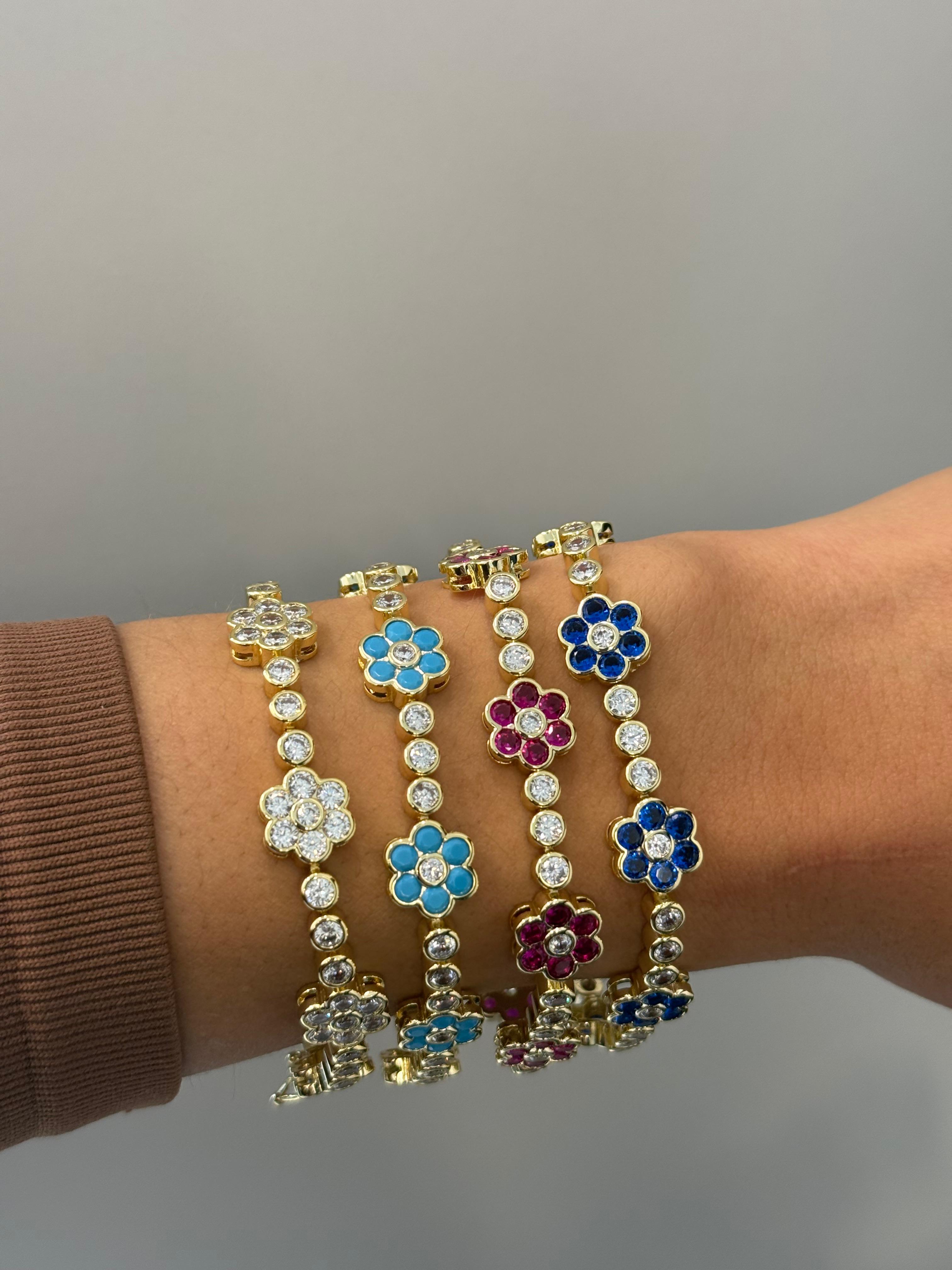 A refined floral design set with rich stones and subtle diamond accents throughout. Polished and feminine, this bracelet adds an effortless touch of color and sparkle while remaining easy to wear every day. A modern floral classic designed to stand alone or layer seamlessly.